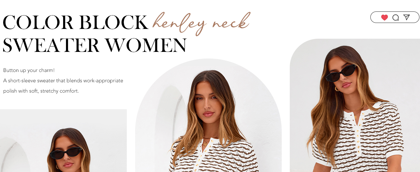 • Features: Featuring a classic Henley neckline with button-up detailing for adjustable style. The distinctive color-blocking pattern adds modern flair, while ribbed cuffs and hem provide a polished, structured finish to this versatile short sleeve sweater for women.