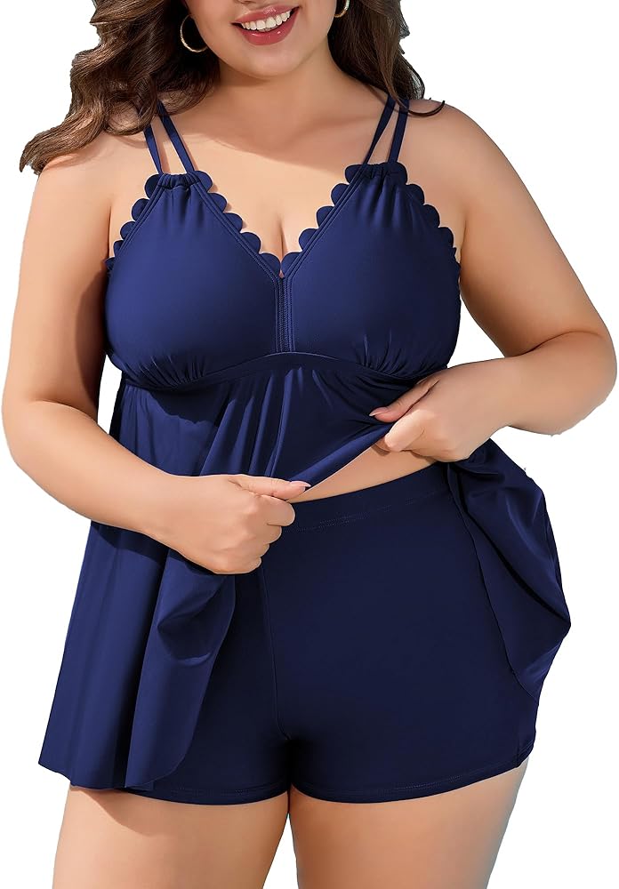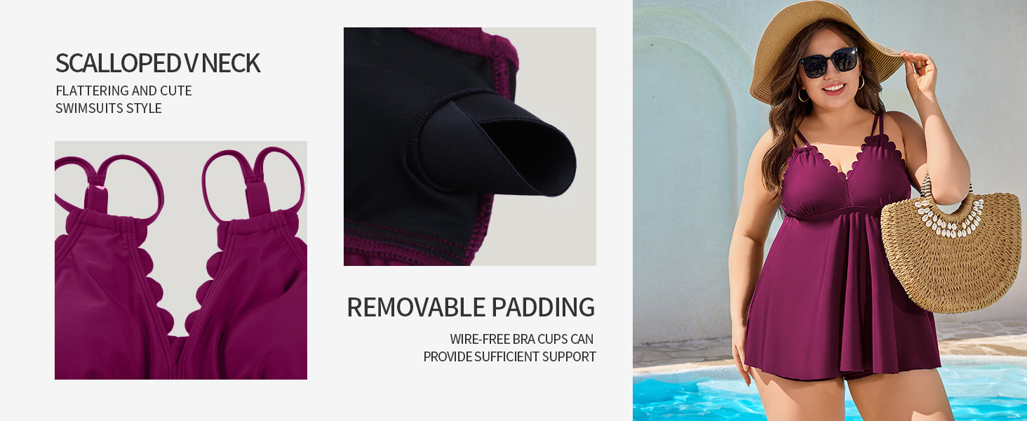 • بدلة سباحة تانكيني بمقاس كبير: بدلة سباحة تانكيني برقبة على شكل حرف V بمقاس كبير مع تصميم زخرفة صدفية، توفر مظهرًا عصريًا وأنيقًا. تغطية كاملة لقاع السباحة ستتجنب الإحراج