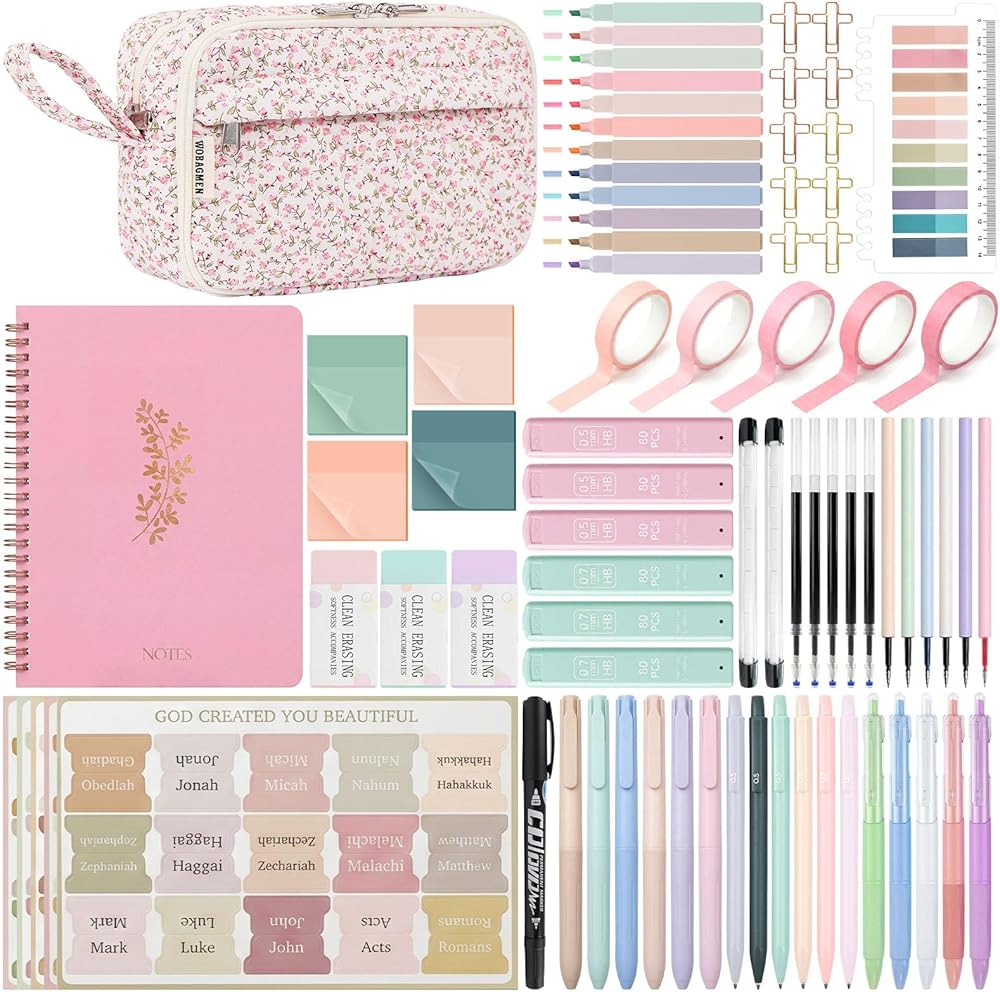 Bible study is a personal and meaningful time for reflection, prayer, and spiritual growth. Having your supplies ready and organized allows you to focus more deeply on scripture without distraction. This Bible journaling kit brings together carefully selected tools in soft, calming colors that help you highlight verses, organize notes, and reflect on your faith with clarity and peace. Transparent notes and index tabs make it easier to revisit important passages, while smooth-writing pens and gentle highlighters support consistent daily study. The elegant quilted pencil pouch keeps everything protected and easy to carry, so your Bible journaling tools are always within reach—whether at church, in a study group, or during quiet devotion at home. Thoughtfully designed for both beginners and experienced Bible journalers, this set encourages consistency, organization, and a deeper connection with God's word. It is also a meaningful gift that supports and inspires the daily faith journey.