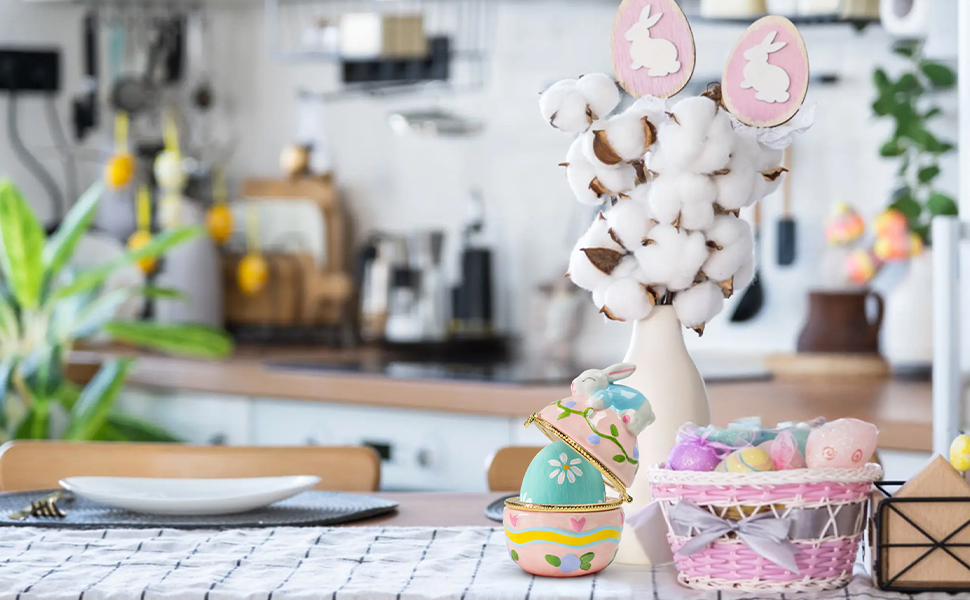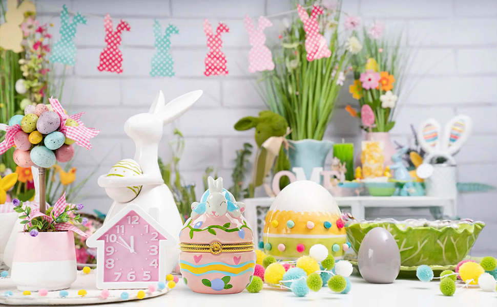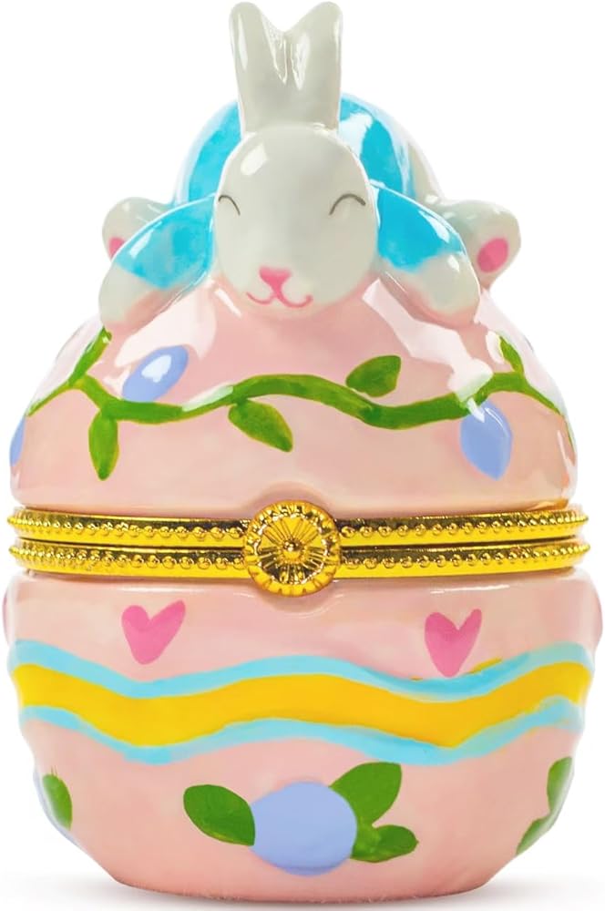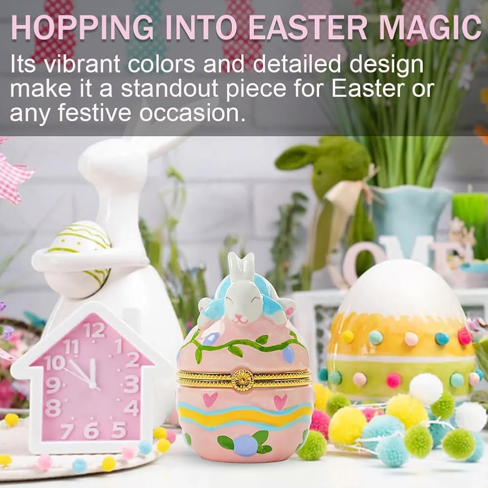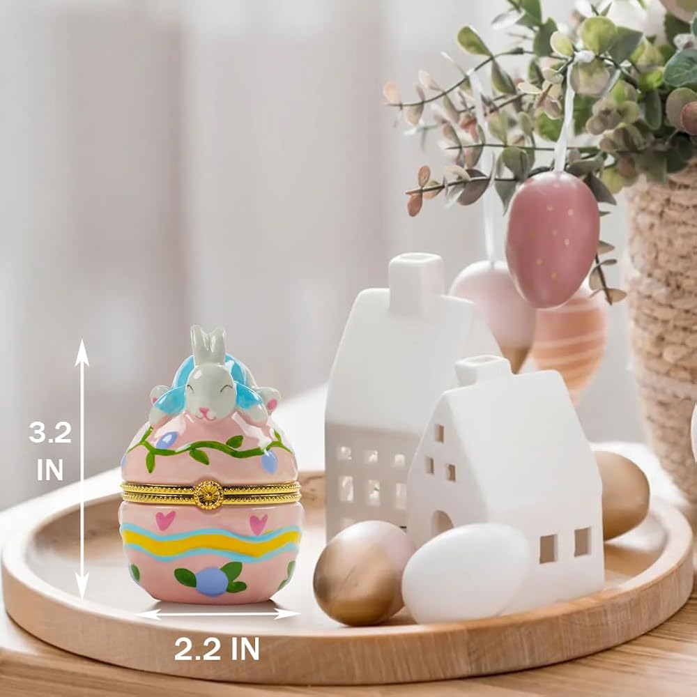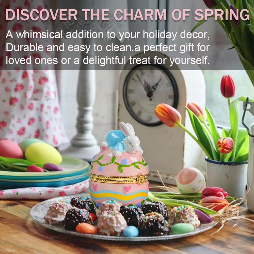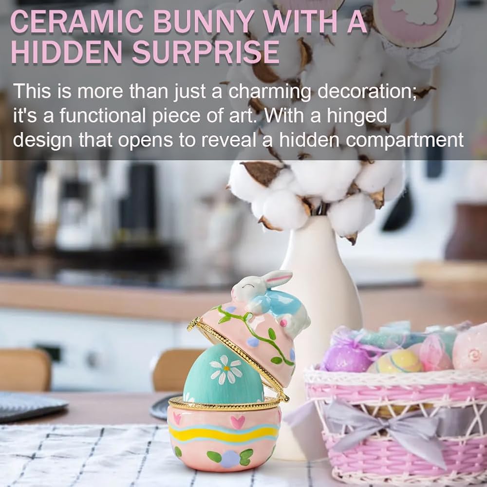• - كن مطمئنًا مع ضمان الجودة لدينا! صندوق حلية أرنب عيد الفصح مصنوع من السيراميك المتين، وهو مصنوع ليدوم طويلاً، مما يضمن لك الاستمتاع بسحره المبهج للعديد من العطلات القادمة.