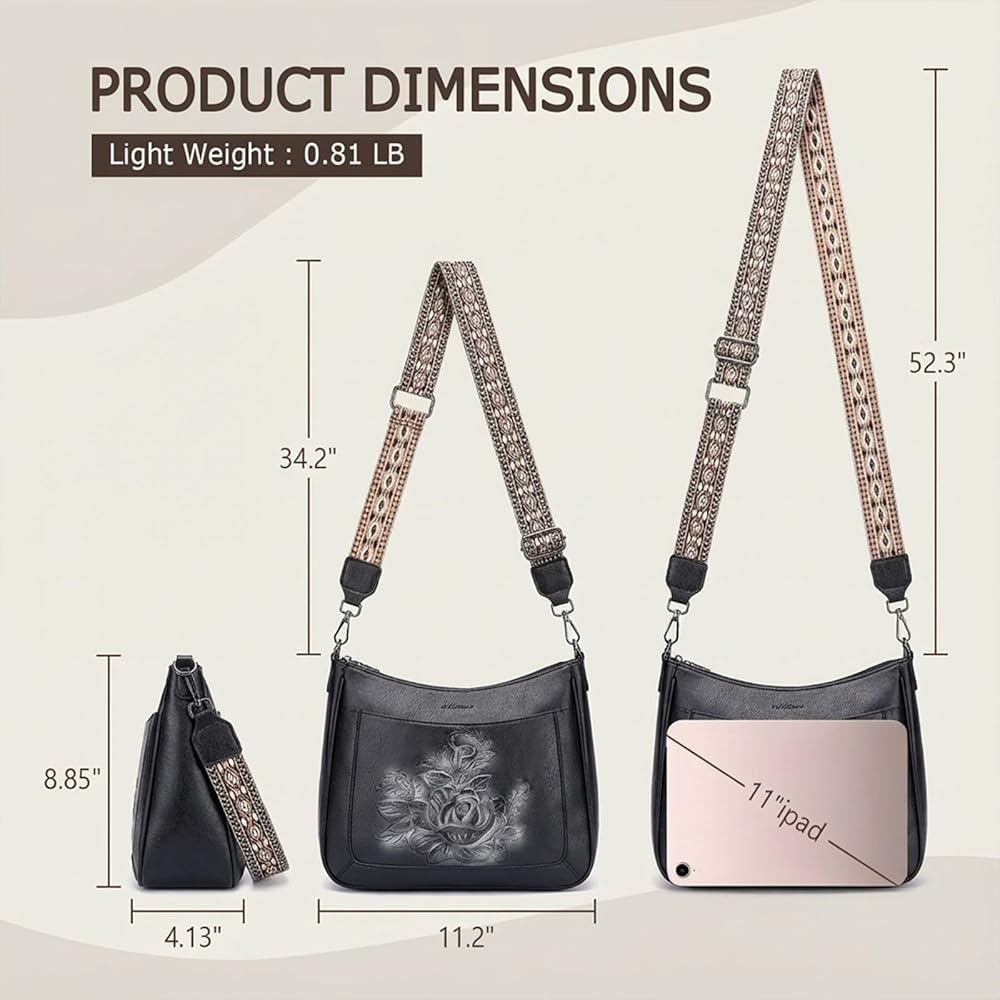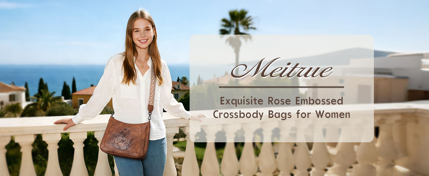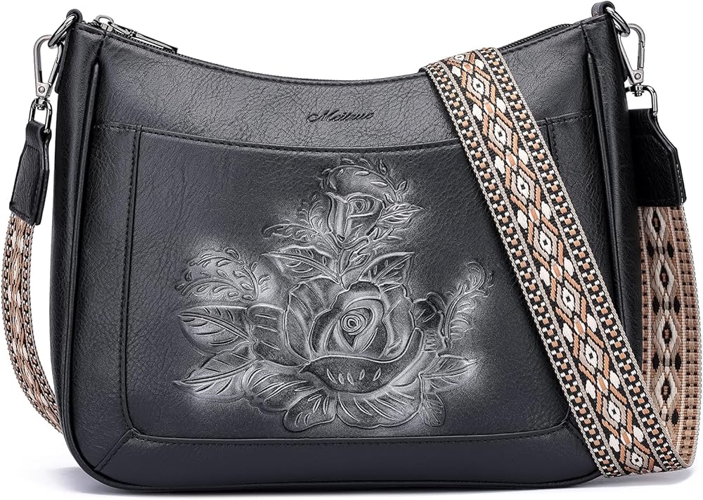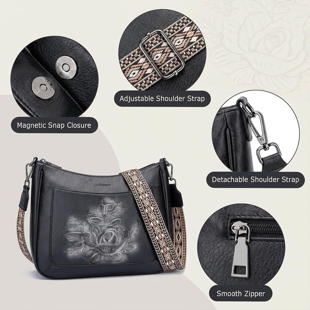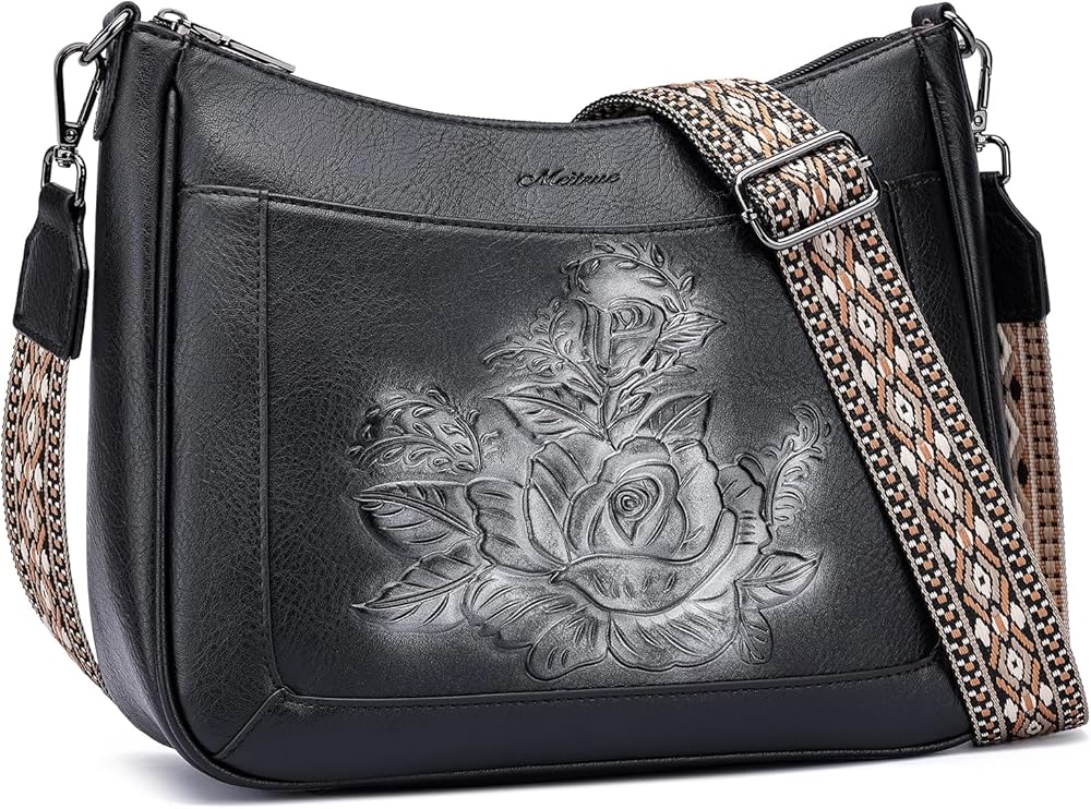 MEITRUE Crossbody Bags for Women,Rose Embossed Vegan Leather Medium Hobo Purse with Strap Travel Shoulder Handbag