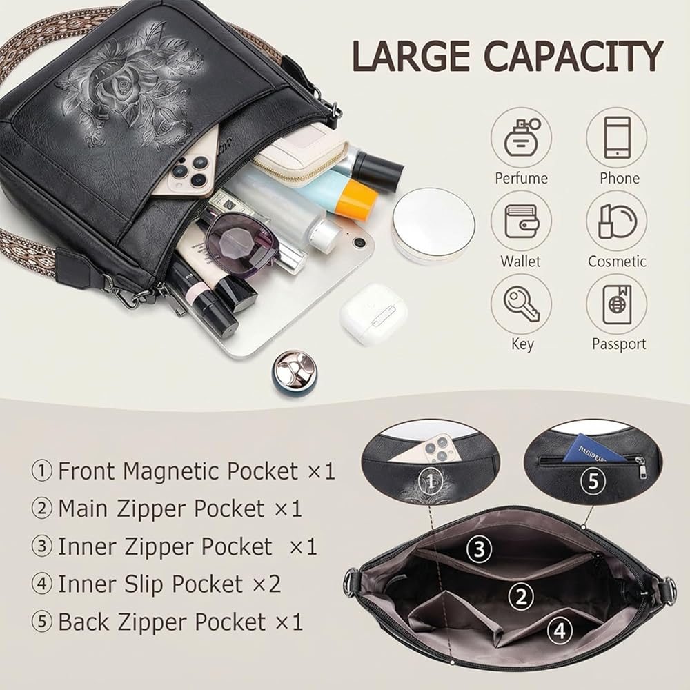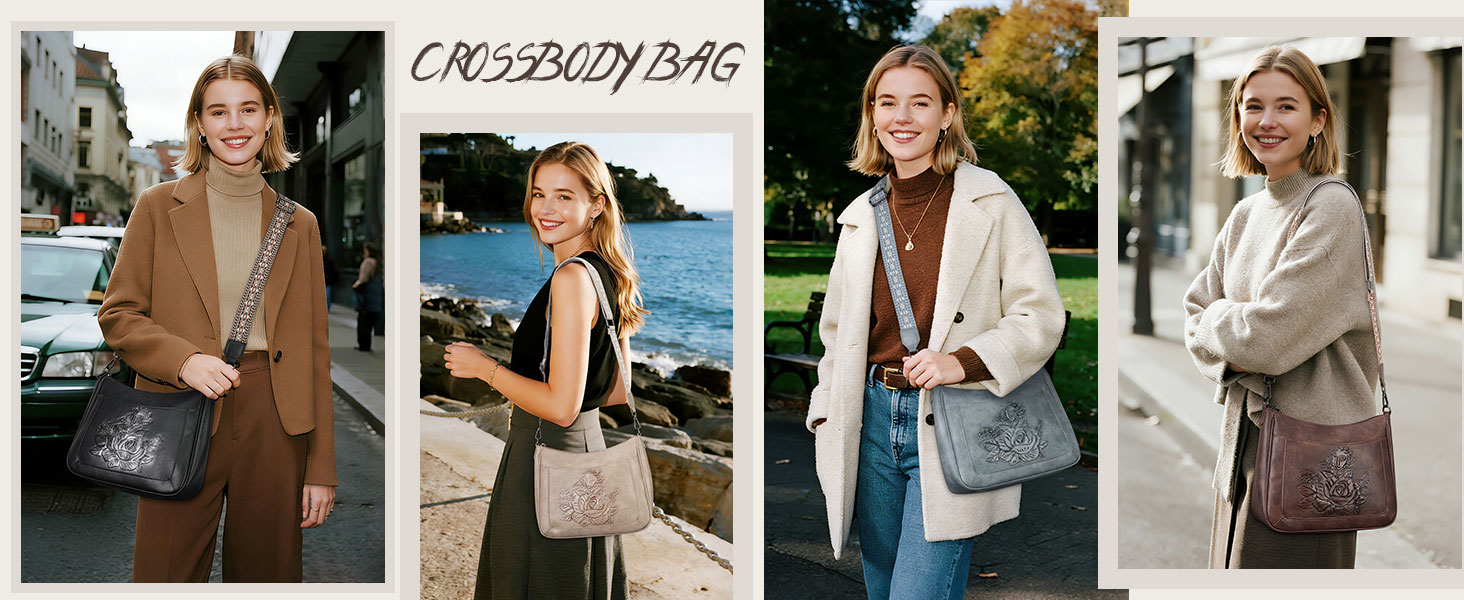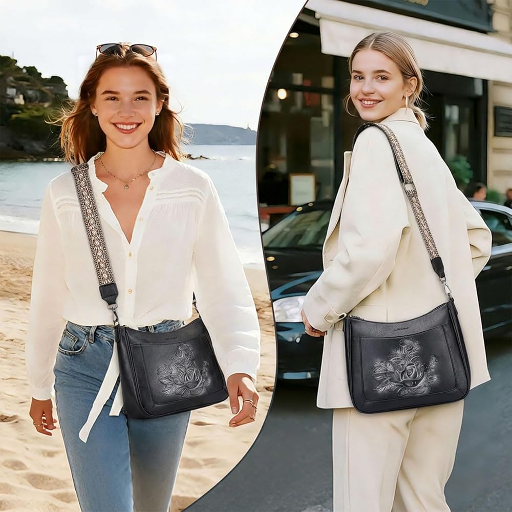 Signature Rose-Embossed Design:This crossbody bags for women is crafted from our signature 3D rose-embossed design on premium vegan leather, delivering rich sculpted texture and refined depth; the elegant raised detailing adds feminine charm and understated luxury—effortlessly elevating everyday outfits from casual denim to feminine dresses