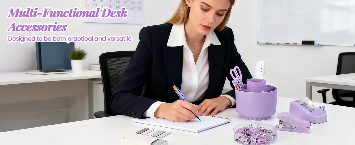 [ملحقات مكتبية متعددة الوظائف]: كل ما تحتاجه لقضاء يوم عمل أو جلسة دراسة فعالة موجود بشكل أنيق في مجموعة إكسسوارات المكتب الأرجوانية الأنيقة هذه. تم تصميمه ليكون عمليًا ومتعدد الاستخدامات، فهو يلبي جميع احتياجاتك في حل واحد أنيق