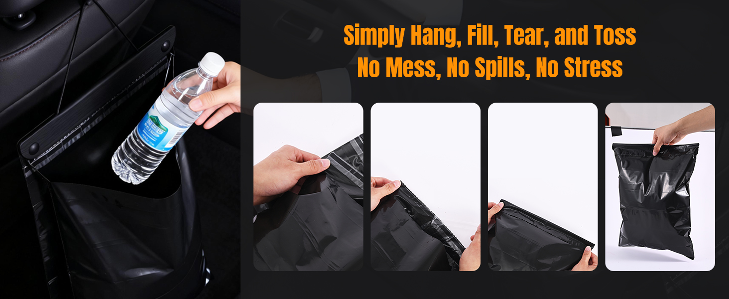 • سهل التمزيق: ببساطة قم بتعليقه وملؤه وتمزيقه ورميه. التصميم المثقوب يجعل من منتجاتنا أسهل كيس قمامة للسيارات للاستعمال مرة واحدة. لا فوضى ولا انسكابات ولا ضغوط - يمكن أن تكون سلة المهملات المثالية في السيارة بديلاً للسائقين والعائلات المشغولين.