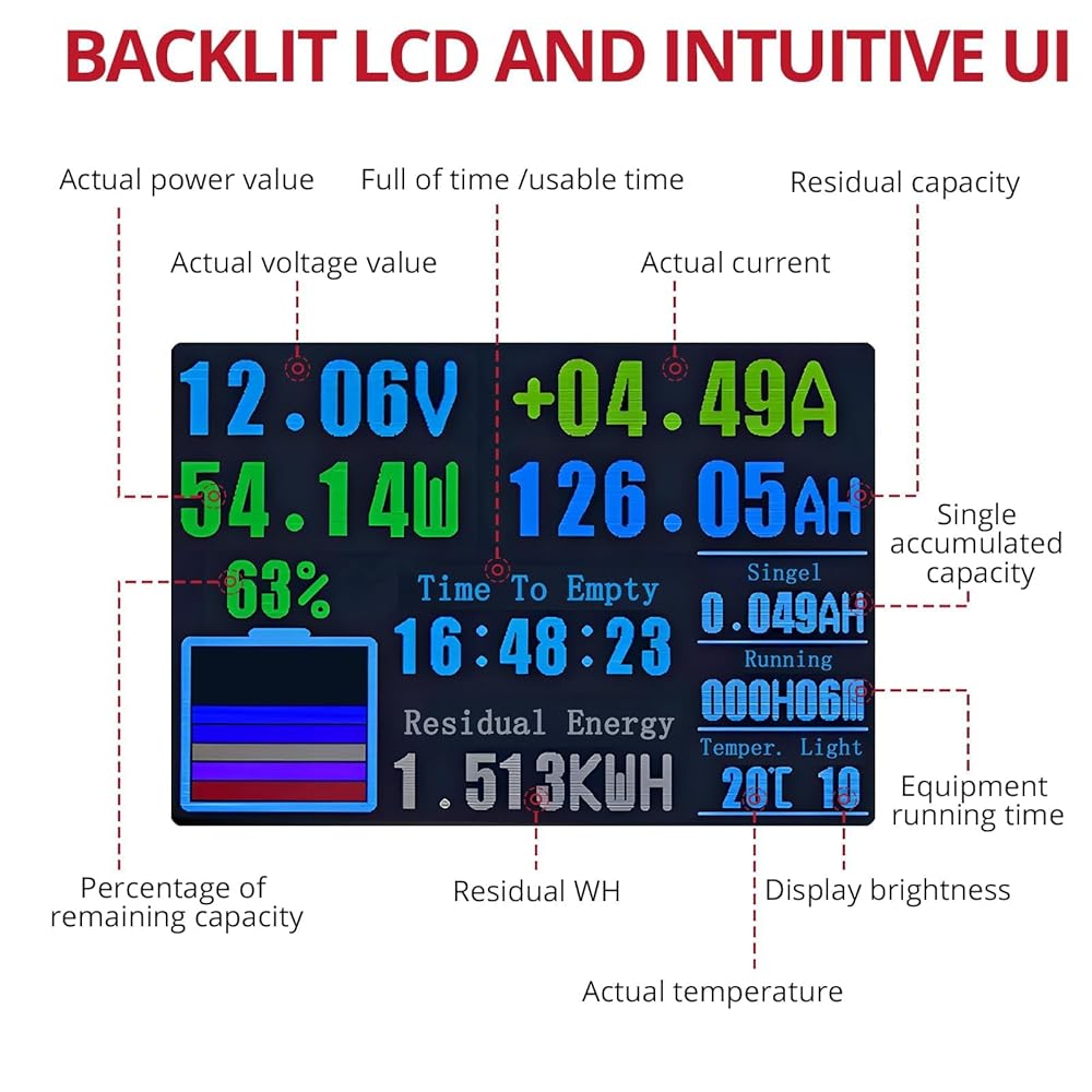 【عرض البيانات في الوقت الحقيقي】تتتبع شاشة البطارية الذكية لدينا الجهد الكهربي والتيار والطاقة والسعة المتبقية ووقت التشغيل ودرجة الحرارة المحيطة في لمحة. مجهزة بأربعة أوضاع للعرض: عرض بسيط وعرض منحنى وعرض البيانات الكاملة وعرض البيانات التاريخية للإشراف الشامل على البطارية