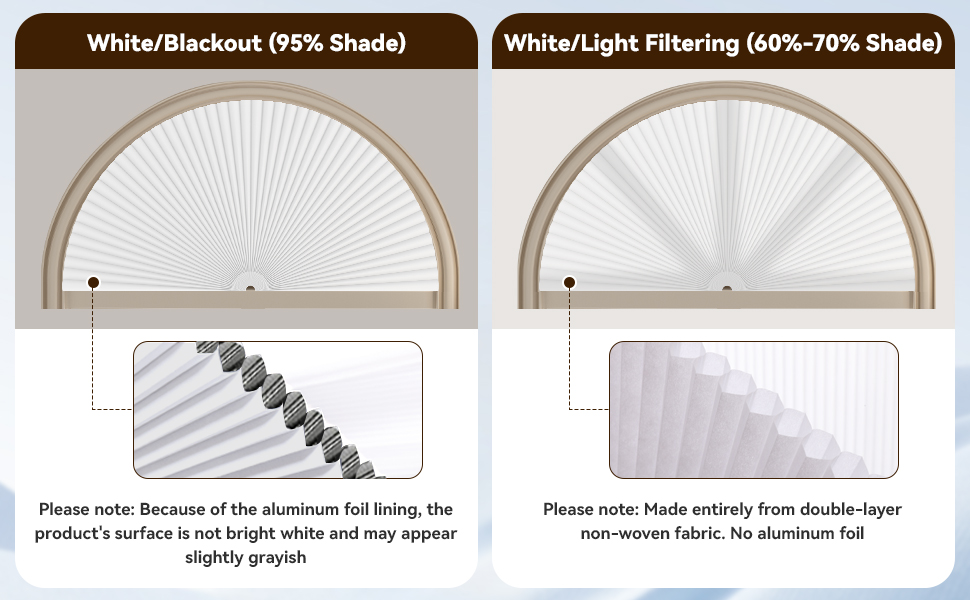حل متعدد الاستخدامات وأنيق: ستائر التعتيم اللاسلكية للنوافذ المقوسة أو نصف المستديرة توفر التنوع والأناقة. يمكن استخدام ظل النافذة المقوسة على نطاق واسع في المناطق المنزلية مثل غرفة الطعام، والمطبخ، وغرفة النوم، وغرفة المعيشة، وغرفة الغسيل، والحمام، والحديقة، والتخزين، والمزيد