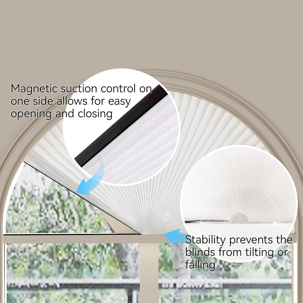 مناسب للنوافذ المقوسة: مصمم خصيصًا للنوافذ المقوسة التي يبلغ نصف قطرها 24 بوصة أو أقل. توفر الظلال الخلوية اللاسلكية تشذيبًا سهلاً للنوافذ غير المنتظمة. لا حاجة لحفر ثقوب في الجدران. فقط قم بالقص وفقًا لنصف قطر النافذة