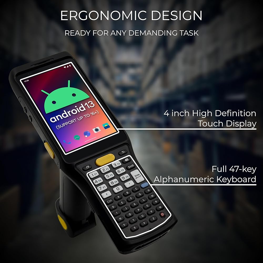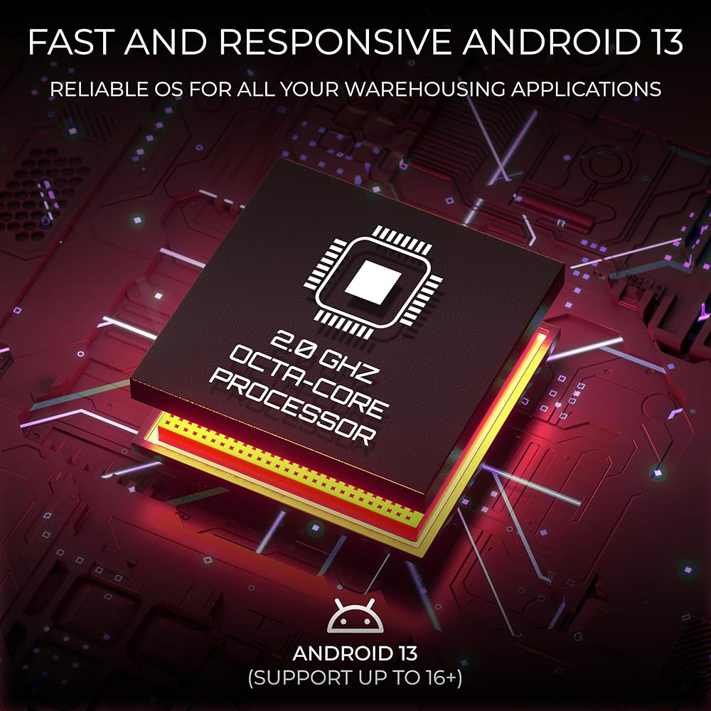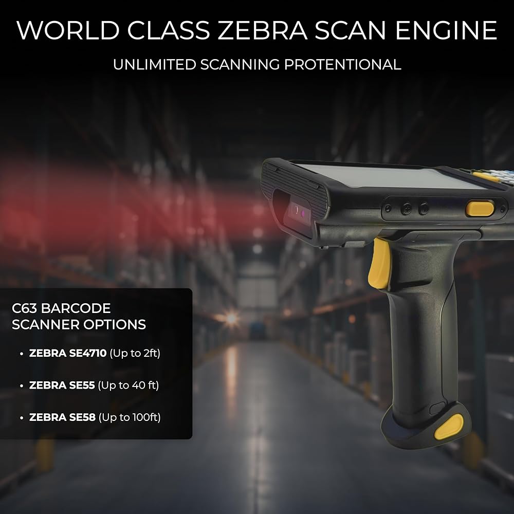 The Chainway C63 is a powerful wireless Android pistol-grip handheld barcode scanner engineered for fast, accurate, and high-volume inventory workflows. Equipped with industry-leading Zebra scan engines, you can choose the performance tier that fits your operation: choose between the SE4710 (2 ft) for everyday scanning, the SE55 (40 ft) for versatile mid-to-long range reads, or the SE58 (100 ft) for extreme long-distance rack and pallet scanning. Running Android 13 with upgrade support through Android 16+, the C63 delivers long-term platform stability, security updates, and broad app compatibility. Its IP67 rugged construction withstands drops, dust, and moisture. Perfect for warehouses, distribution centers, retail backrooms, logistics operations, and manufacturing. With built-in WiFi, Bluetooth, NFC, and GPS, the C63 keeps teams connected and productive, while the ergonomic pistol-grip design reduces fatigue during long scanning shifts.