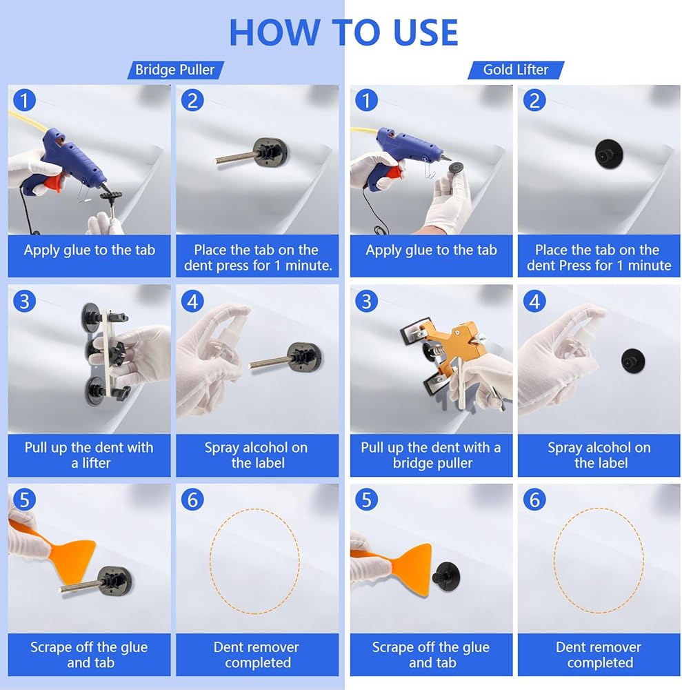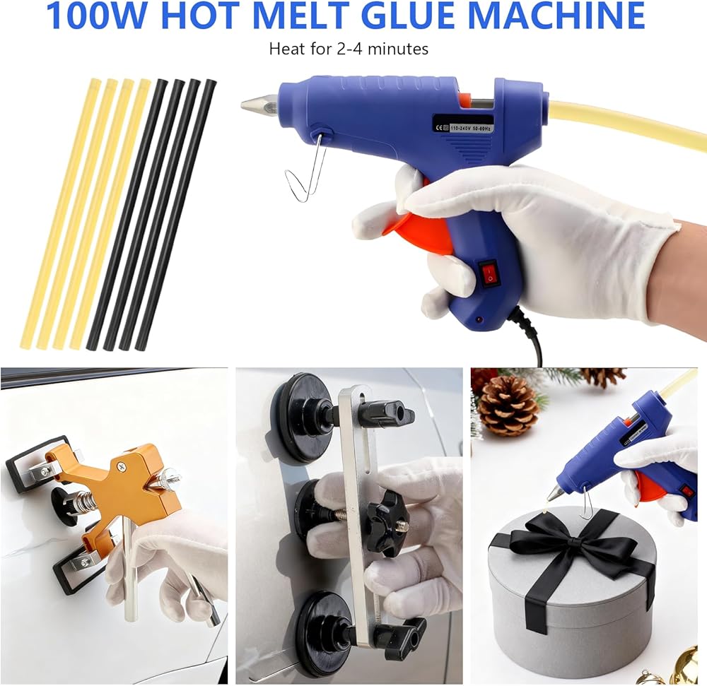 • 【كيفية الإصلاح والنصائح】1. قم بتنظيف سطح دنت السيارة، 2. ضعي الغراء الذائب الساخن، ضعي الغراء الذائب الساخن على علامة السحب. 3. ضع لسان السحب على السن واضغط لمدة 2-3 دقائق. ثم اسحب السن للأعلى. 4. بعد إصلاح الانبعاج، قم برش مادة الكاوهل على الساحبة وقم بإزالة الغراء باستخدام مكشطة. نصائح: الغراء الخاص بنا سهل الإزالة، لا داعي للقلق بشأن بقايا الغراء على جسم السيارة. يجب تسخين الأدوات لمدة 3-4 دقائق قبل الاستخدام.