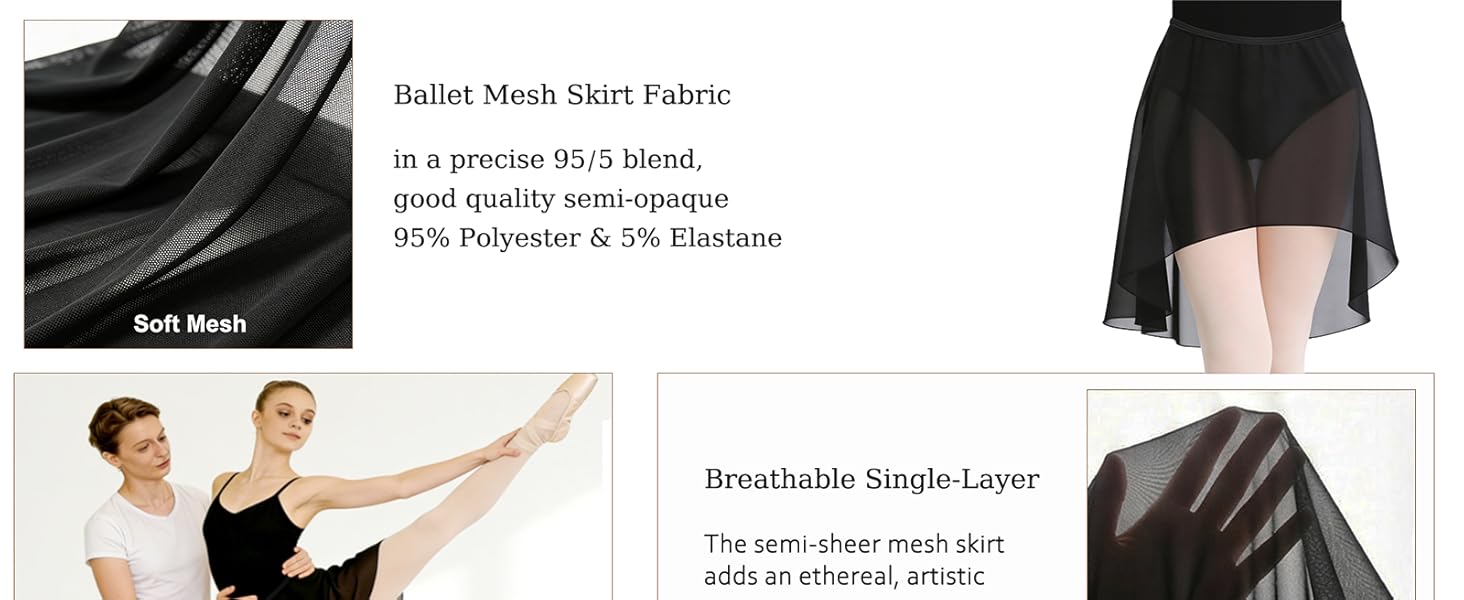 المواد: مصنوعة من 95% بوليستر و5% إيلاستين، تتميز تنورة الباليه الشبكية بحرفية شبكية معززة لتعزيز المتانة والارتداء طويل الأمد.