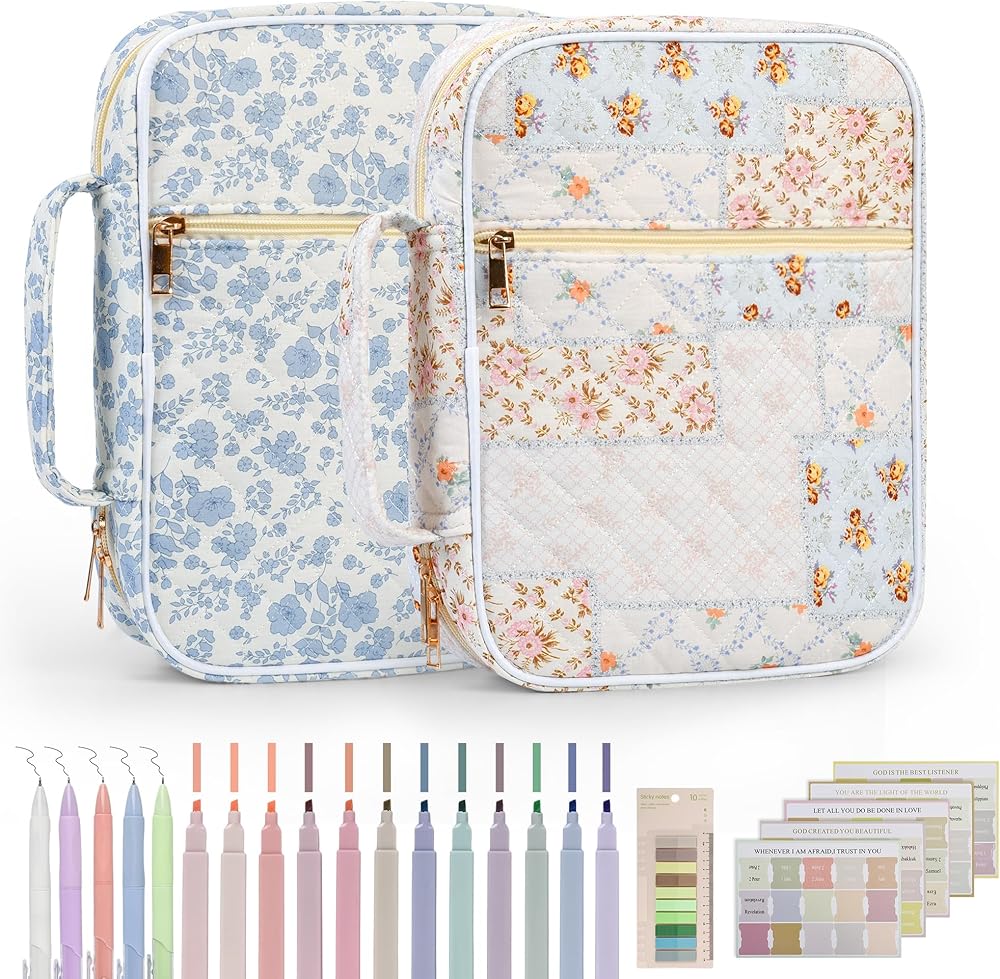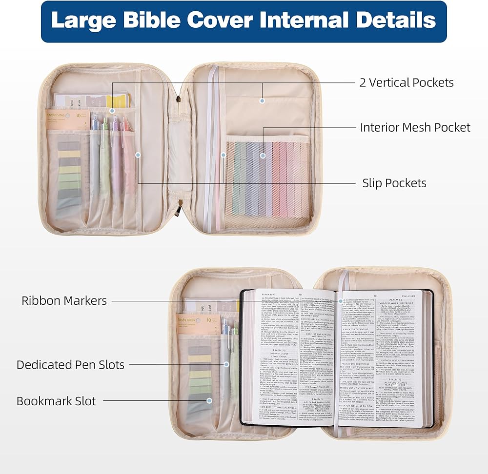 • INCLUDES COMPLETE BIBLE STUDY KIT: Say goodbye to buying supplies separately! The interior features smart organization with multiple pockets, pen slots, and a mesh compartment. BEST OF ALL, this set comes with a massive accessory bundle including: 12 Pastel Highlighters, 5 Pens, 1 Sticky Note Pad, and 5 Sets of Bible Tabs (suitable for both women and men). Everything is neatly organized in one place for more focused study, indexing, or worship.