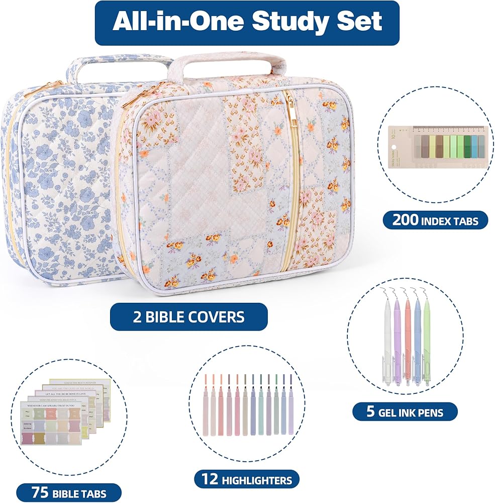 • UNBEATABLE 2-PACK VALUE SET: This premium set includes 2 High-Quality Quilted Bible Covers plus a complete Study Supplies Kit, offering exceptional value for money. Each cover (Exterior Size: 11.42" x 8.89" x 2.76") is designed to fully protect your Bible from daily wear, scratches, and spills. It's the perfect solution for anyone looking for a reliable bible carrying case that comes with everything you need to start your study immediately.