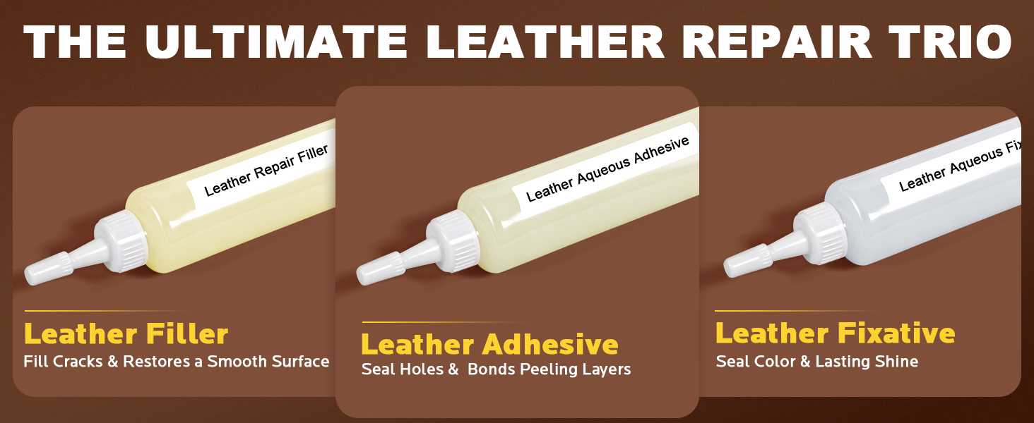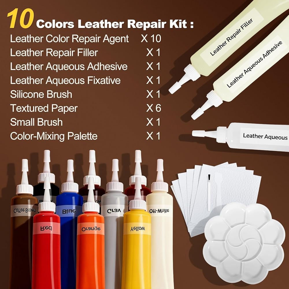 مجموعة إصلاح الجلود الكاملة: تتضمن 10 مركبات إصلاح ألوان و3 عوامل أساسية: حشو جلدي، ومانع تسرب مائي، ولاصق. تأتي المجموعة مجهزة بالكامل بـ 6 أوراق حبيبية، ولوحة خلط، وملعقة سيليكون، وفرشاة تفصيلية - كل ما تحتاجه لتحقيق نتائج ترميم احترافية في المنزل