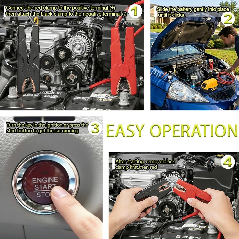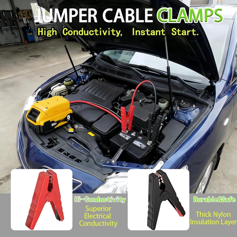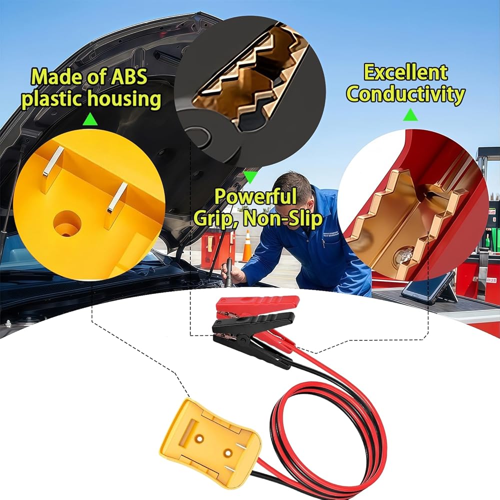 • حل جديد تمامًا: هل تقطعت بك السبل ببطارية سيارة مستنزفة ولا يوجد أحد بالقرب منك للمساعدة في البدء السريع؟ توفر كابلات التوصيل الخاصة بنا الحل الجديد تمامًا، مما يتيح لك الاستفادة بسهولة من الطاقة من بطارية الأداة اللاسلكية الموجودة لديك وتشغيل سيارتك في دقائق.