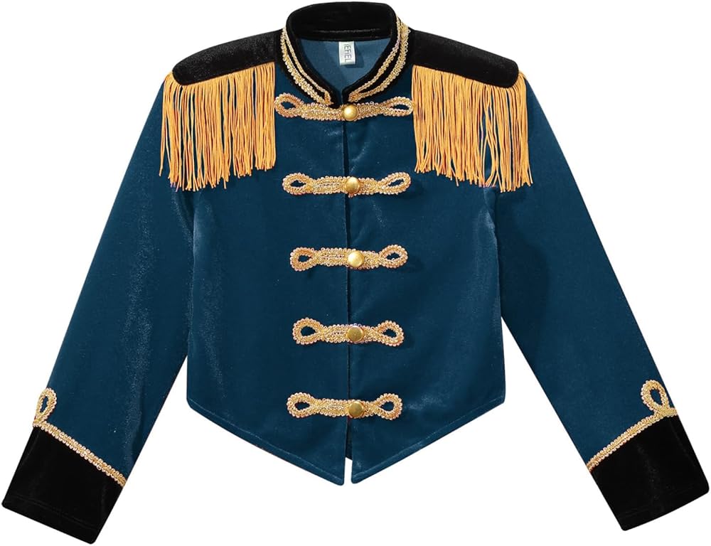 - A circus costume jacket for girls, stand collar, long sleeve and front button closure