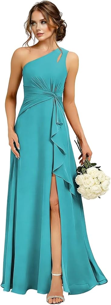 Features: One Shoulder with ruched bust design make this bridesmaid dress flattering and gorgeous, Flowy chiffon bridesmaid dresses with pockets for women, elegant One Shoulder pleated prom gown with empire waist, Sleeveless The look is complete with an A-line skirt and leg slit