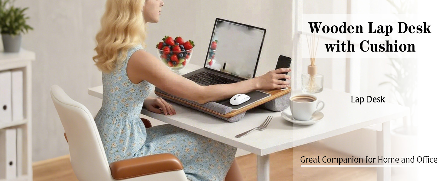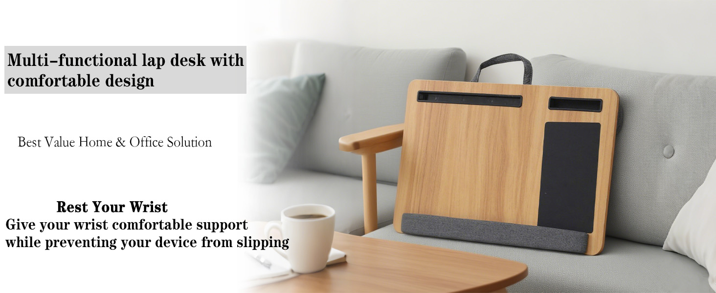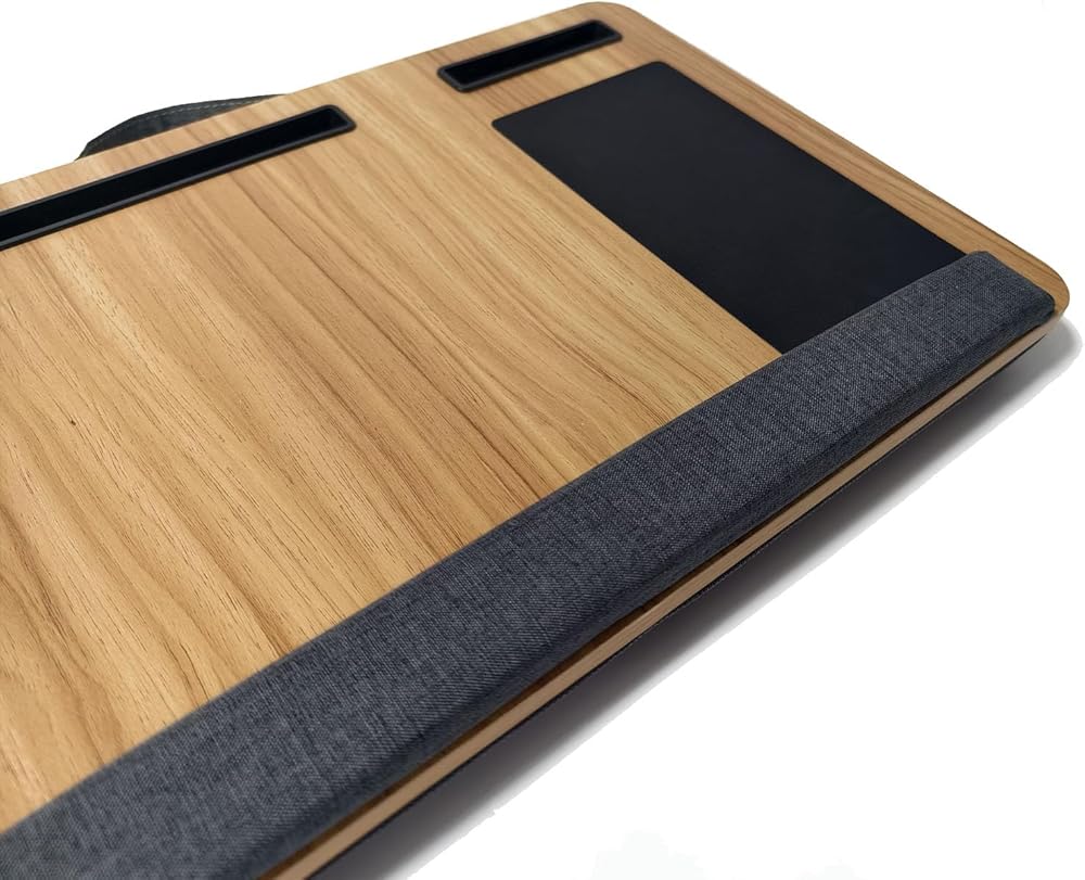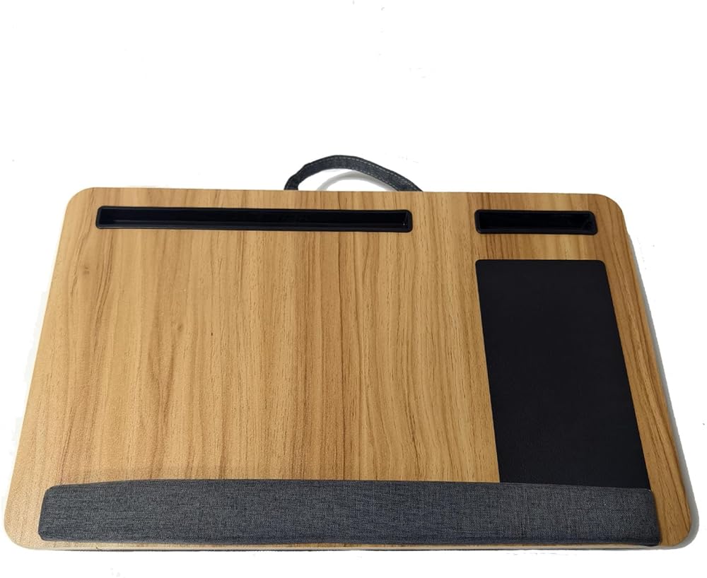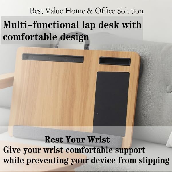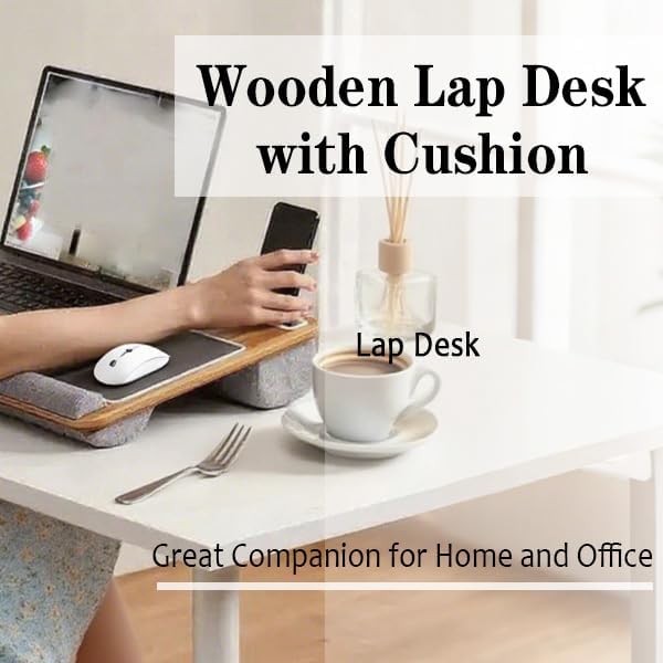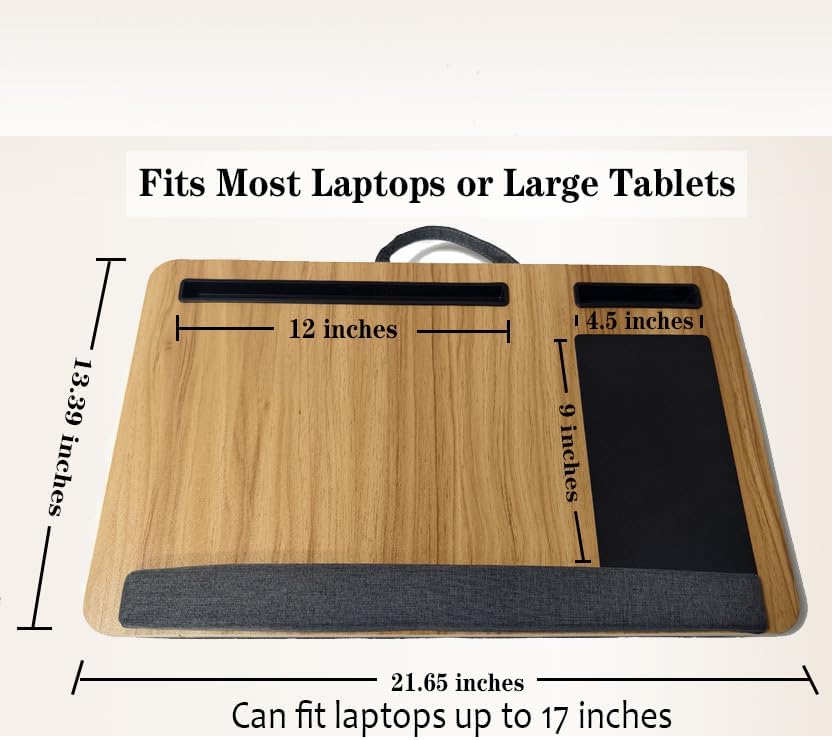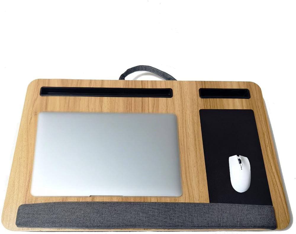 مكتب خشبي مع وسادة، حل للعمل من المنزل، خفيف الوزن، يناسب كمبيوتر محمول يصل إلى 17 بوصة، حامل خفيف الوزن مع وسادة معصم ناعمة، وسادة كمبيوتر محمول للأريكة