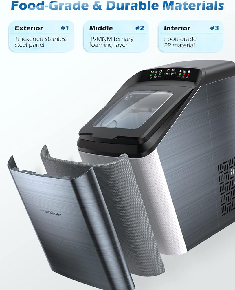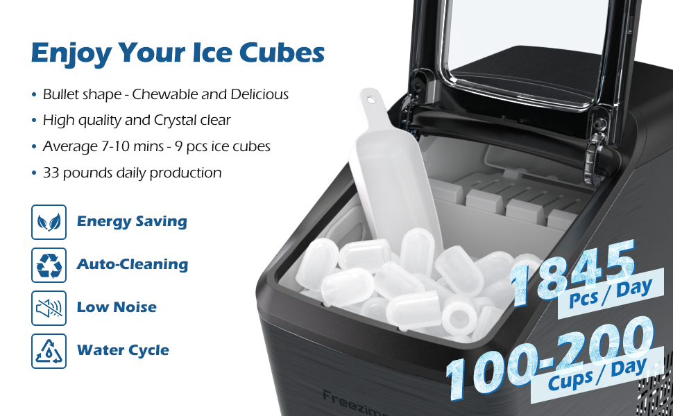 【مكعبان ثلج يمكن اختيارهما】مكعبات الثلج الشهيرة على شكل رصاصة التي تنتجها صانعة الثلج المحمولة فريزيمر ليس من السهل ذوبانها أو لصقها، ويمكن اختيار حجمين مختلفين من مكعبات الثلج (S/L). رائعة للاستخدام في حفلات الشواء وبارات الطابق السفلي والمقاهي والحفلات المنزلية وما إلى ذلك.