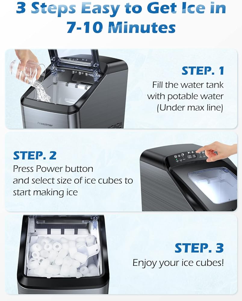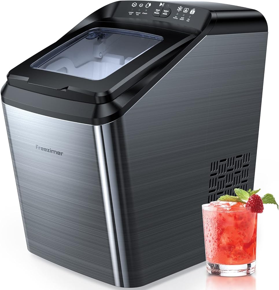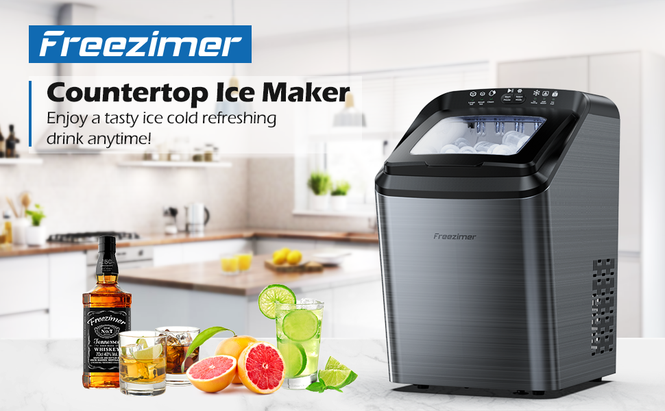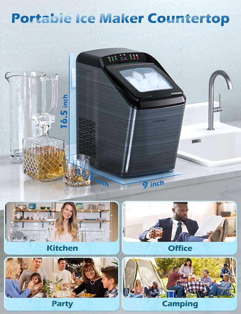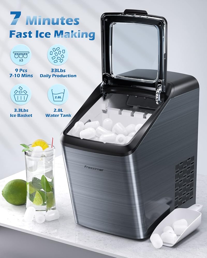 سطح عمل صانعات الثلج من فريزيمر، 33 رطل/24 ساعة، سطح عمل ماكينة صنع الثلج المحمول، 9 مكعبات جاهزة في 7-10 دقائق، مكعبان ثلج بحجمين، ماكينة ثلج ذاتية التنظيف مع مغرفة ثلج وسلة وكوب قياس