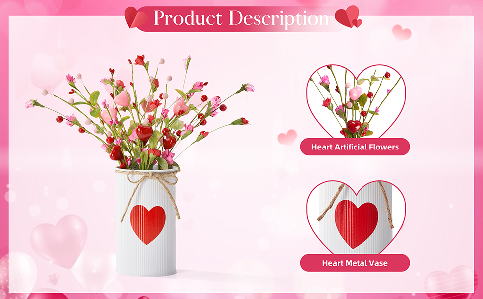 • تصميم فريد: تتضمن مجموعة ديكورات طاولة عيد الحب الخاصة بنا مزهرية معدنية بيضاء مطبوعة على شكل قلب، و4 قطع من الزهور الاصطناعية على شكل قلب. تجتمع هذه الملحقات لتشكل ديكورًا مثاليًا لطاولة عيد الحب، مما يضمن أن تكون ديكورات عيد الحب الخاصة بك فريدة من نوعها. زينة عيد الحب لدينا ليست مجرد زينة ولكنها تستخدم أيضًا بمفردها.
