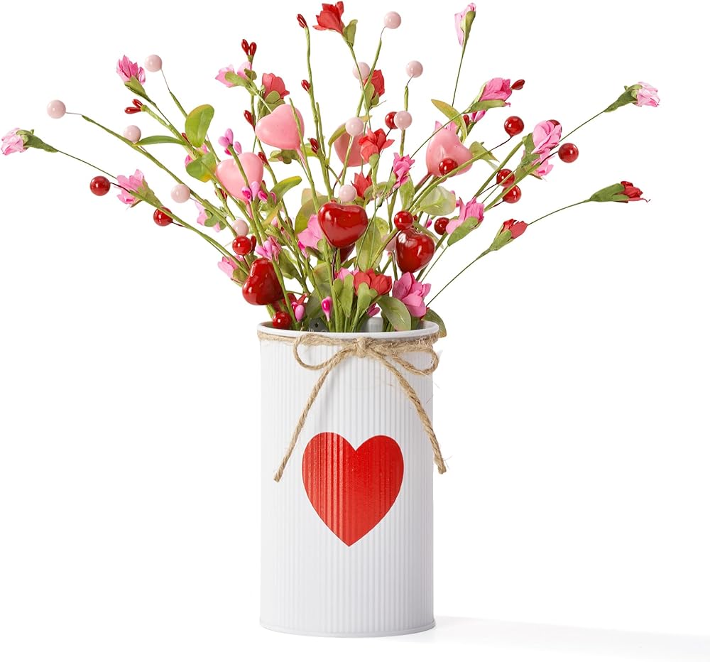 قطع مركزية لعيد الحب للطاولات، ديكور طاولة عيد الحب مع مزهرية معدنية بيضاء مطبوعة على شكل قلب، 4 قطع من الزهور الاصطناعية على شكل قلب، ديكورات طاولة عيد الحب في الأماكن المغلقة للمنزل والمطبخ