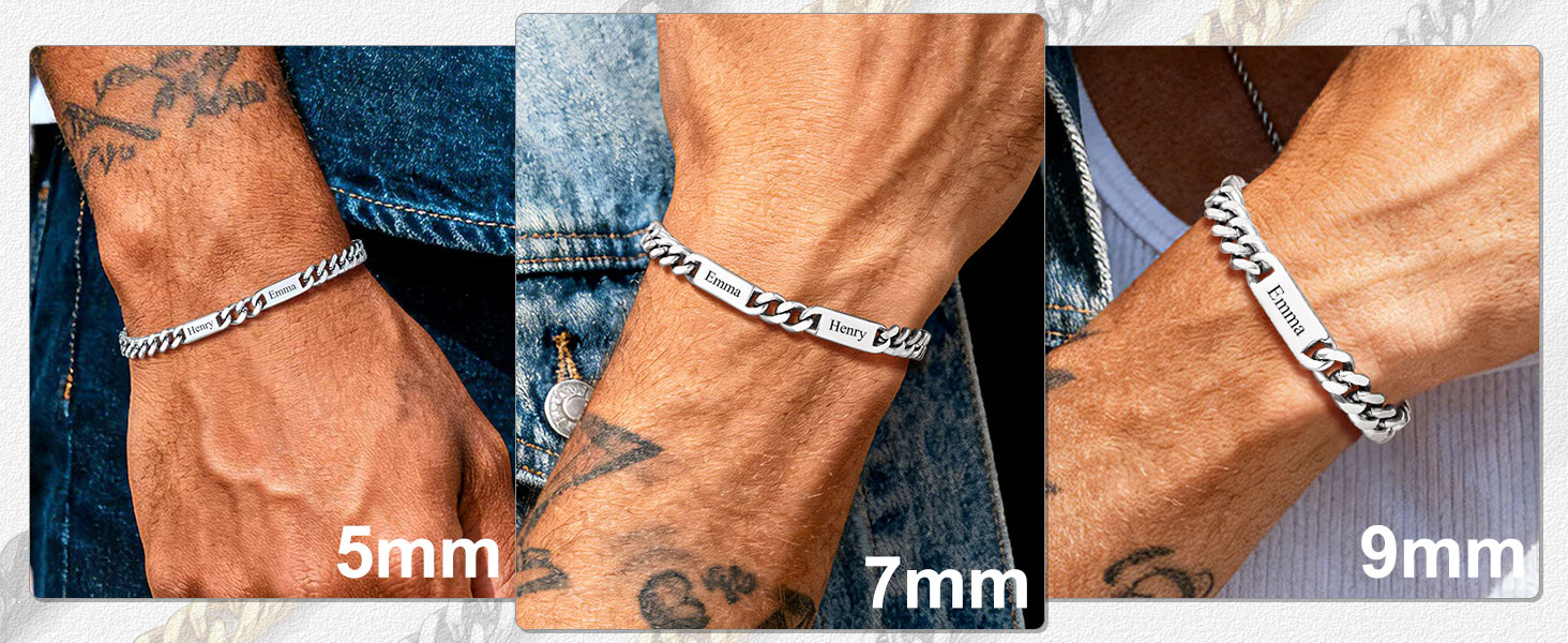 سوار مخصص للرجال والنساء: يعد سوار سلسلة الارتباط الكوبي المخصص بمثابة تذكير خالد بأنك ستدعمهم دائمًا وتحبهم دون قيد أو شرط. بالنسبة له (الأب، الزوج، الجد): اختر عرض 7 مم أو 9 مم لنقش أسماء أفراد العائلة للحصول على القوة التي سيرتديها بكل فخر. بالنسبة لها (الأم، الزوجة): يوفر العرض 5 مم طبقات أنيقة، بينما يوفر العرض 7 مم نمطًا متعدد الاستخدامات للجنسين