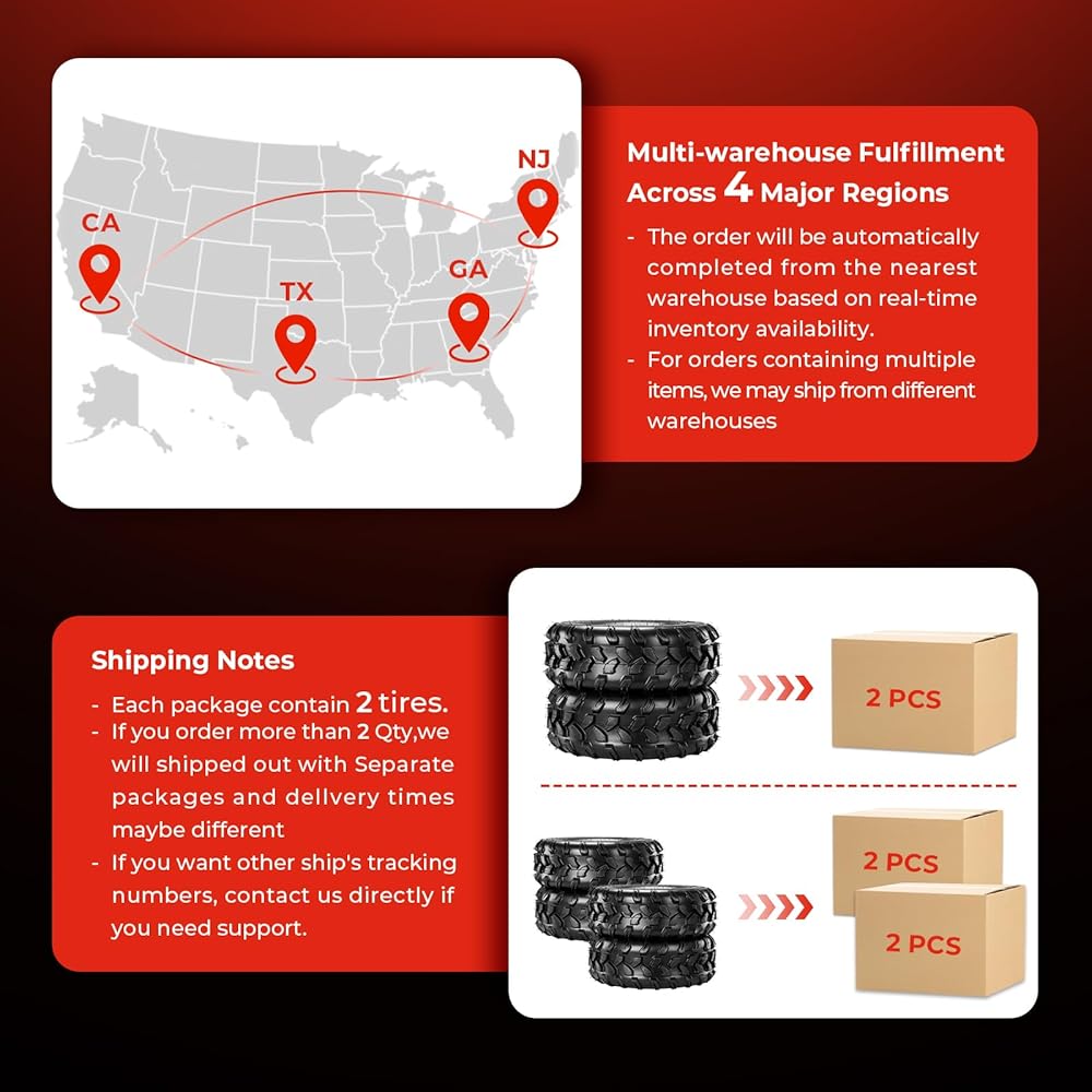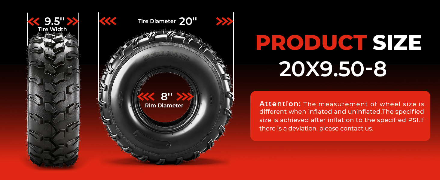 العبوة والإشعار: 20x9.50-8 قطعتان من إطارات ATV/UTV. الحافة (الإطارات) غير متضمنة. ليست مخصصة لخدمة الطرق السريعة!!! ملاحظة: في حالة شراء أكثر من إطارين، فقد يصل طلبك في عبوات متعددة. يرجى الاتصال بنا للحصول على معلومات التتبع إذا لم تستلم الطلب بالكامل