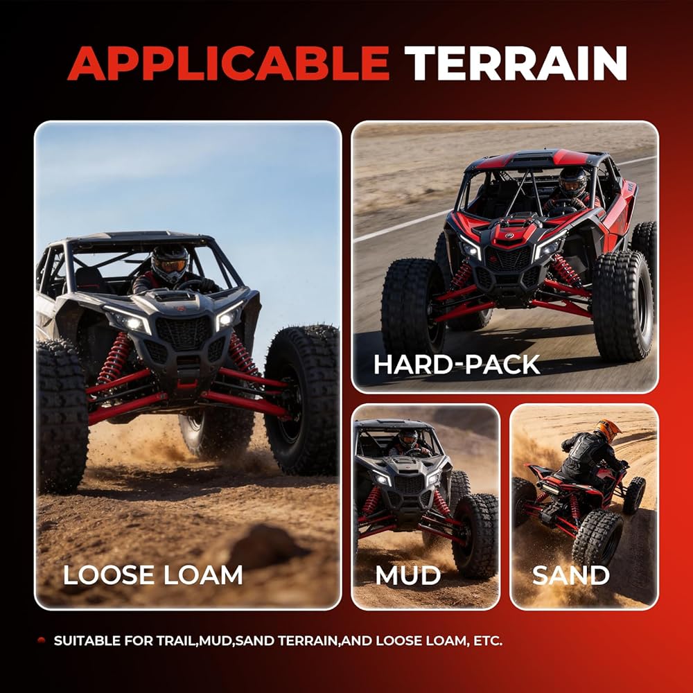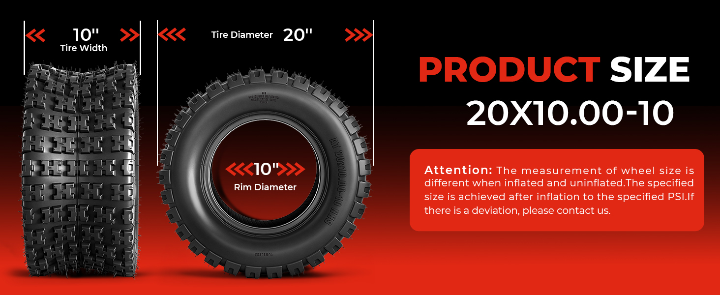 توافق واسع للمركبة: يناسب مواصفات الحجم 20x10-10 (20x10x10) وإطارات 10 بوصة؛ مناسبة لمعظم موديلات ATV وUTV، بالإضافة إلى جزازات العشب والمركبات المساعدة. غير مخصصة للاستخدام على الطرق السريعة.