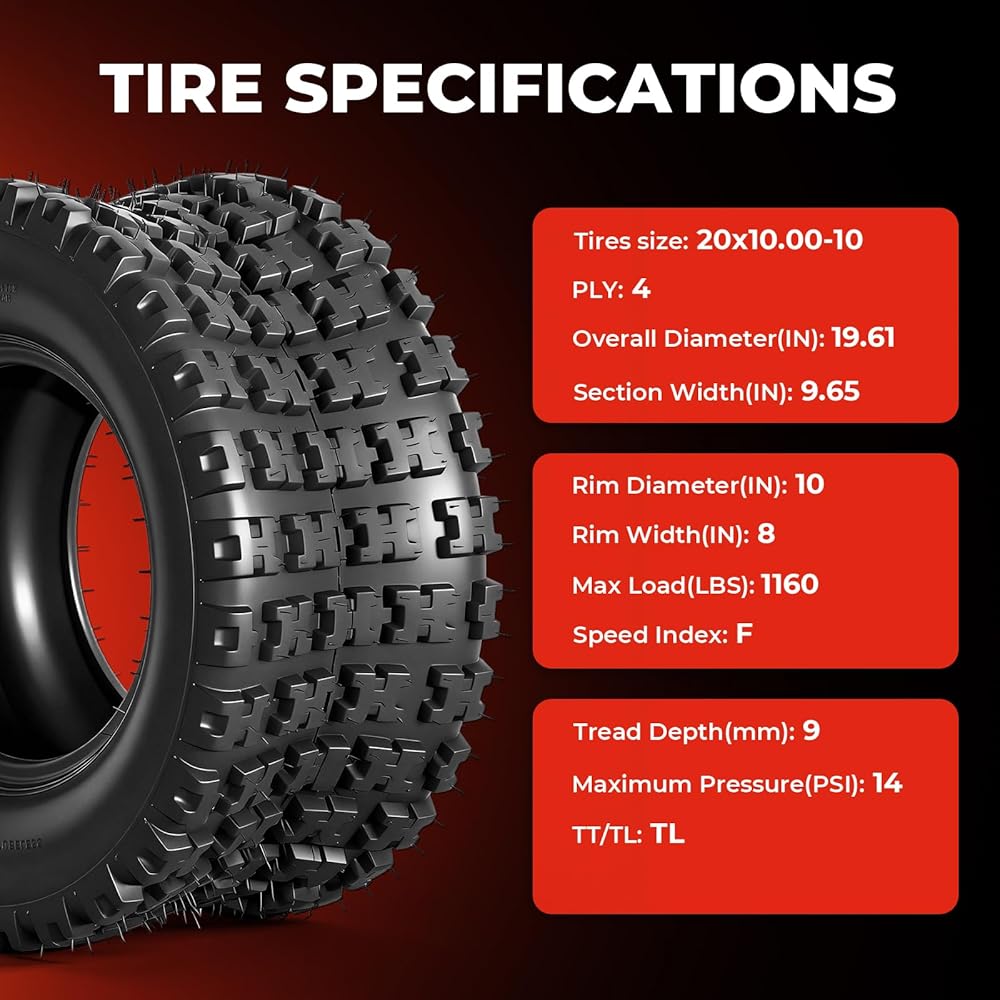 أبعاد الإطار: إطارات ATV 20x10x10، عمق المداس: 9 مم، عرض الحافة: 8 بوصة، قطر الحافة: 10 بوصة، الحد الأقصى للحمولة: 1160 رطل، مؤشر السرعة F، Psi: 14، بدون أنبوب.