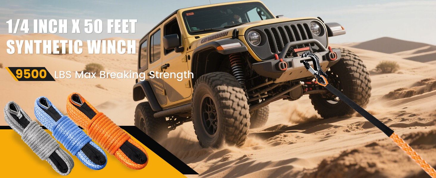 تشمل العبوة: 1 × حبل ونش صناعي مع فتحة معدنية، وحلقة من الفولاذ المقاوم للصدأ وأكمام واقية. طول حبل الونش: 50 قدمًا (15 مترًا). السُمك: 1/4 بوصة (6 مم). أقصى قوة للكسر: 9500 رطل