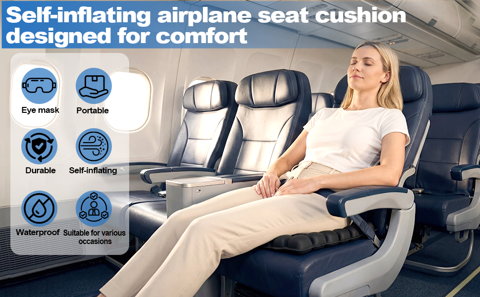وسادة مقعد محمولة قابلة للنفخ، مجموعة وسائد سفر بالطائرة مع حقيبة تخزين، قناع العين وسدادات الأذن، تناسب مقعد الطائرة/السيارة/المكتب/الكراسي (36 خلية هوائية)