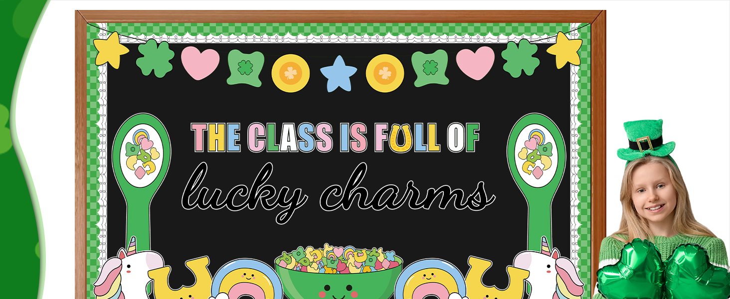 شارع. تصميم موضوع يوم القديس باتريك: مصمم لمجموعة لوحة إعلانات الفصل الدراسي لعيد القديس باتريك، يتميز هذا الديكور بقوس قزح البرسيم وعناصر الحظ مما يخلق جوًا ممتعًا وإيجابيًا في الفصل الدراسي يدعم التعلم والمشاركة الموسمية.
