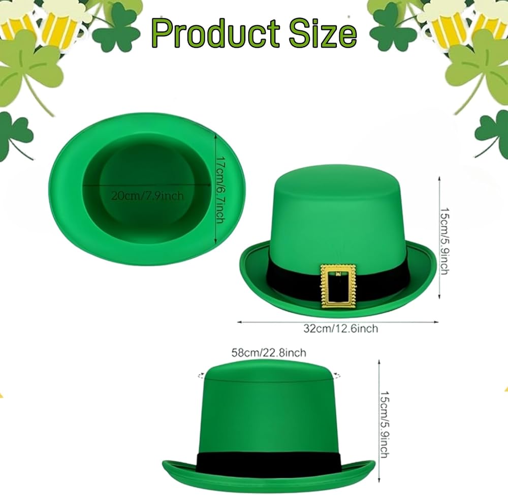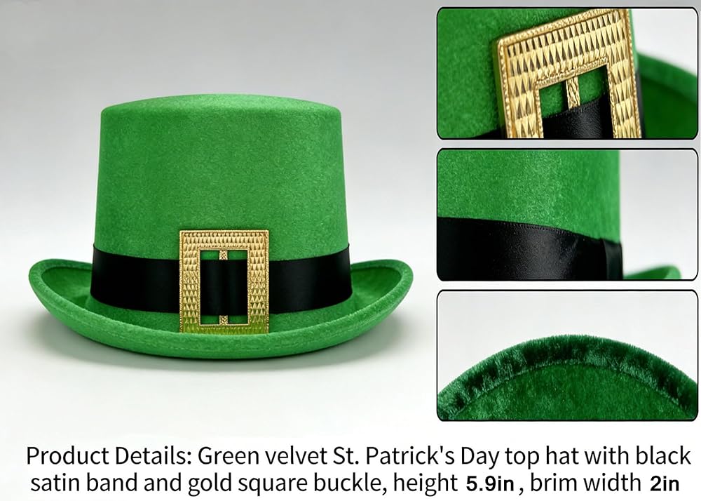 قبعة زي عيد القديس باتريك: قبعة عيد القديس باتريك مصنوعة من مخمل وإسفنج عالي الجودة ناعم وخفيف الوزن لارتداء مريح. إنه مصمم على شكل أنبوب مع إبزيم ذهبي مزين ولون أخضر، والذي يبدو عينة وكلاسيكية، مثالي لإكسسوارات زي عيد القديس باتريك للاحتفال بقدوم عيد القديس باتريك والاستمتاع بأجواء العطلة.