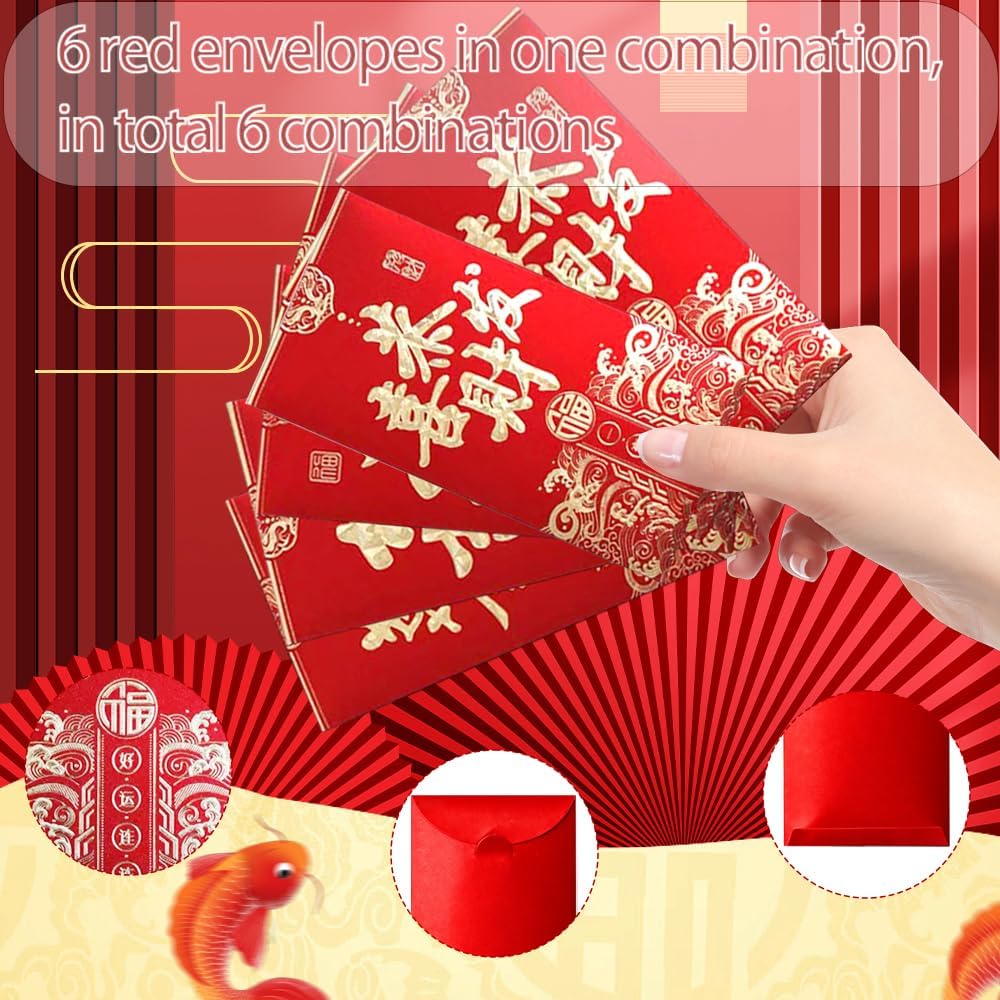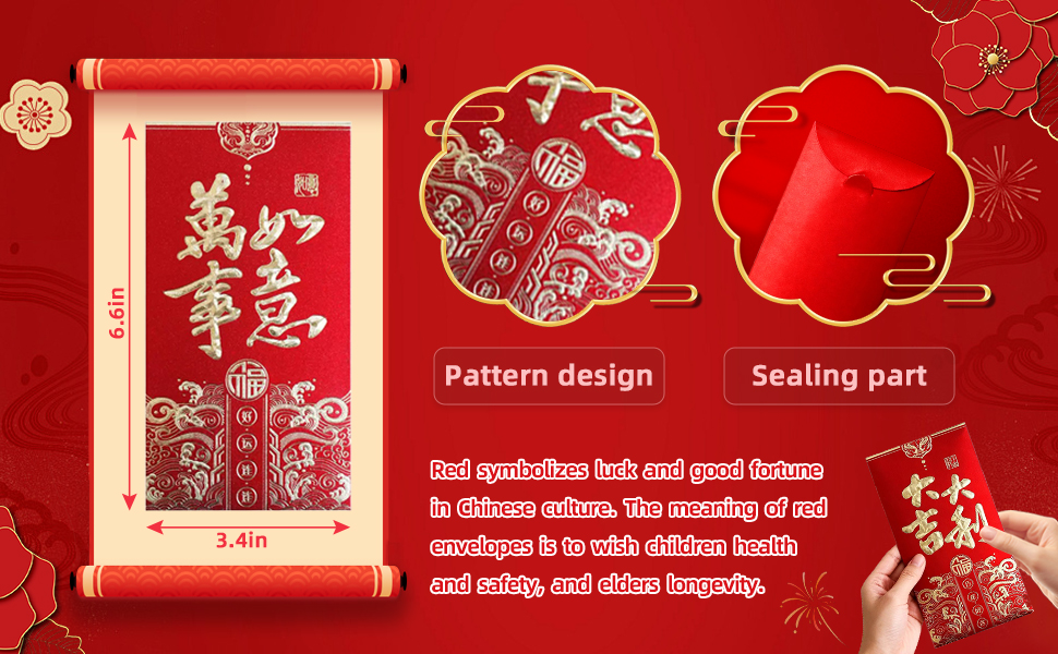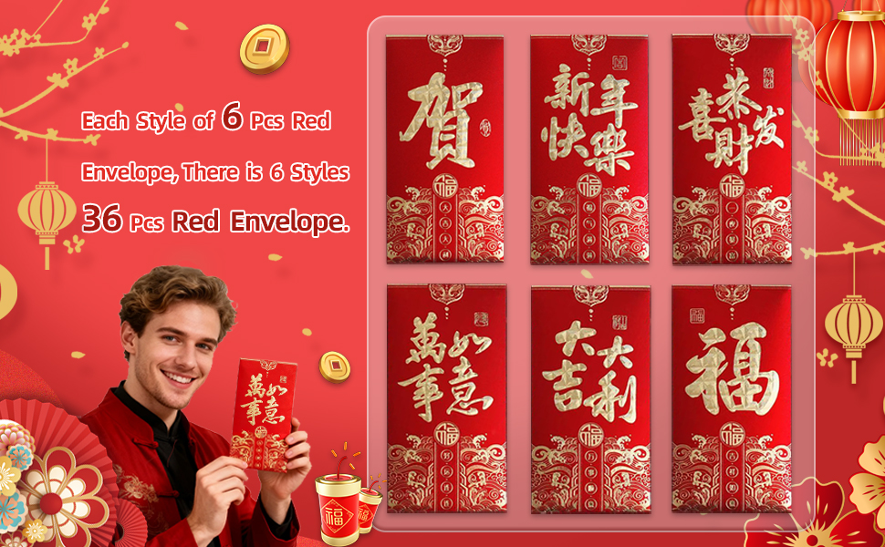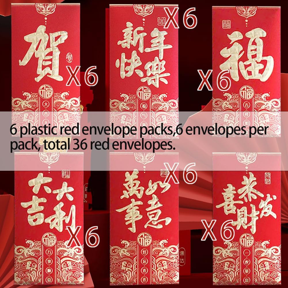 أظرف حمراء للعام الصيني الجديد بتصميم فريد: يوجد 36 ظرف نقود أحمر في 6 تصميمات مختلفة، كل مقاس تقريبًا (9 سم × 17 سم) 3.4 × 6.6 بوصة، كل نمط من الظرف الأحمر للعام الجديد يمثل أمنيات السنة الجديدة الصادقة، مشرقة بضوء ذهبي ومليئة بالبهجة