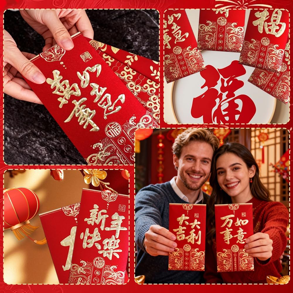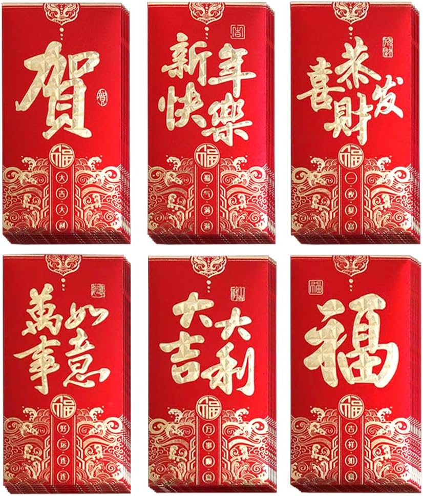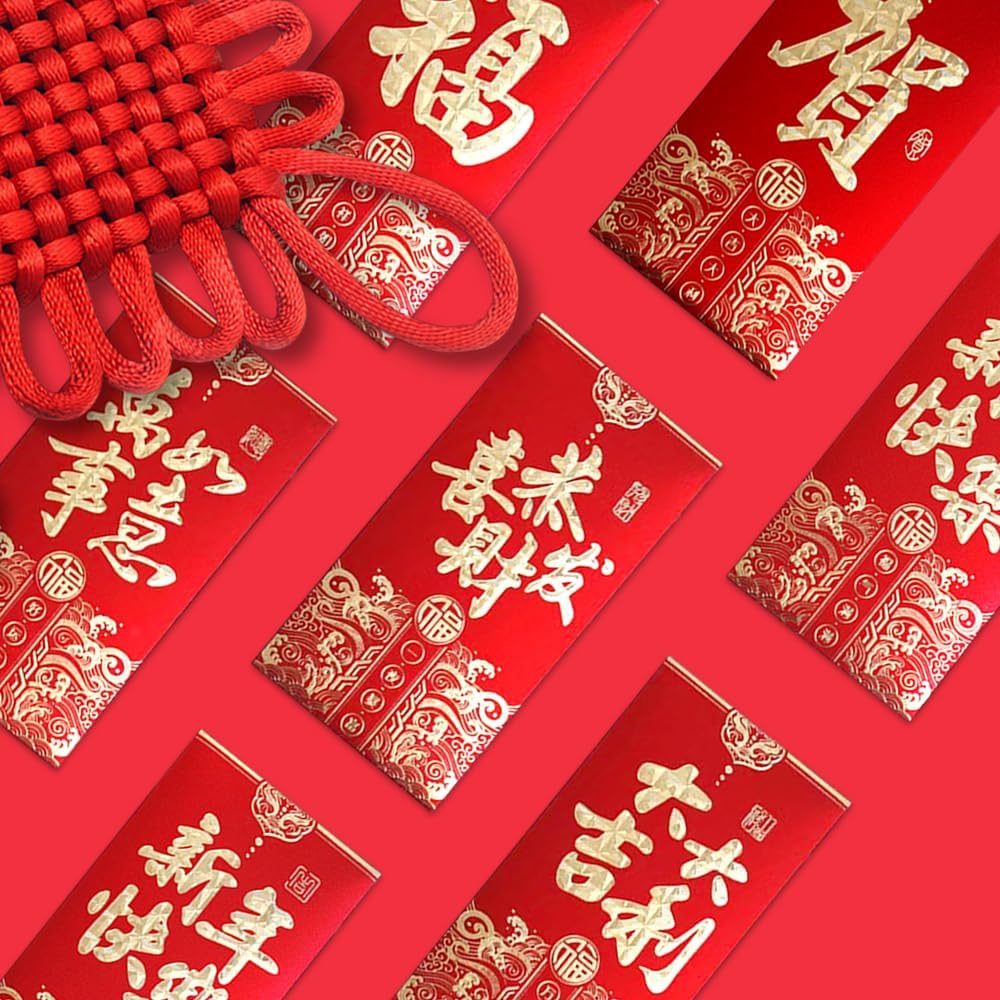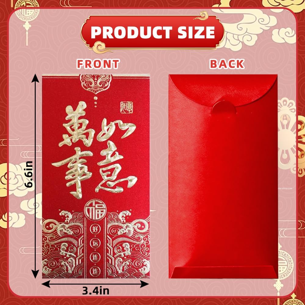 أظرف حمراء للعام الصيني الجديد بتصميم فريد: يوجد 36 ظرف نقود أحمر في 6 تصميمات مختلفة، كل مقاس تقريبًا (9 سم × 17 سم) 3.4 × 6.6 بوصة، كل نمط من الظرف الأحمر للعام الجديد يمثل أمنيات السنة الجديدة الصادقة، مشرقة بضوء ذهبي ومليئة بالبهجة