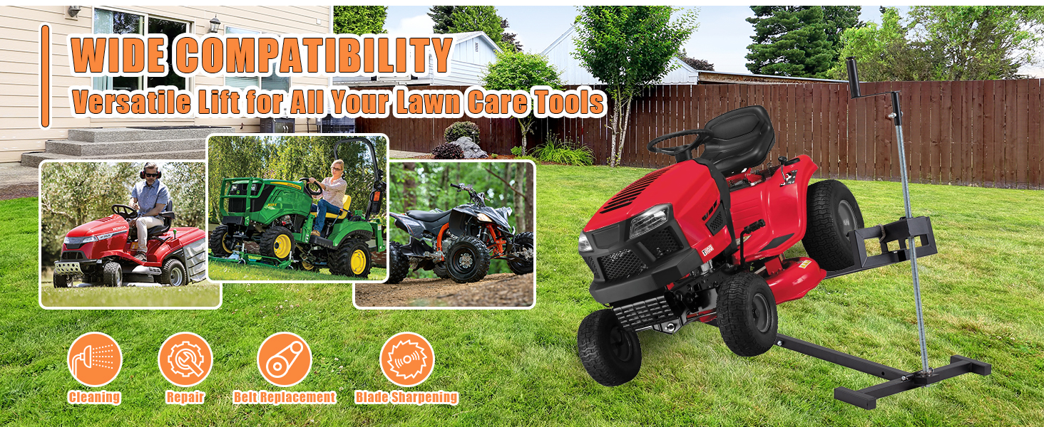 صيانة سهلة وآمنة: هل سئمت من رفع الظهر أثناء صيانة جزازة العشب؟ هل سئمت من الأدوات الضخمة التي تشوش مساحتك؟ يوفر مقبس الرفع الخاص بنا صيانة آمنة وخالية من المتاعب، لذلك يمكنك قضاء وقت أقل في النضال والمزيد من الوقت في الاستمتاع بالفناء الخلفي الأصلي. التخلص من المخاوف المتعلقة بالانقلاب وفشل المعدات؛ ركز على شحذ الشفرة، أو استبدال الحزام، أو تنظيف الهيكل السفلي، أو الإصلاحات الكبرى مع راحة البال التامة