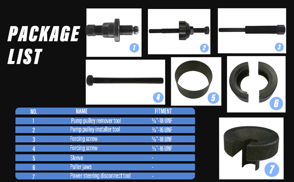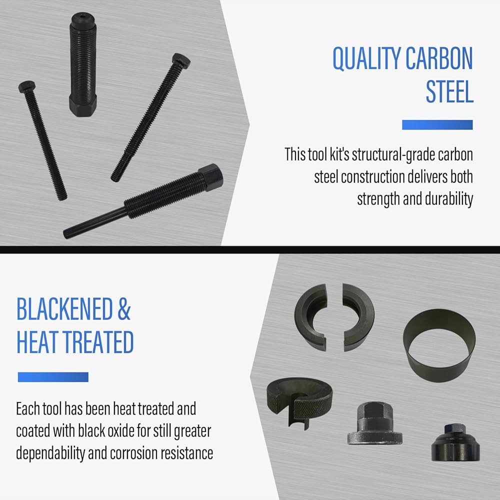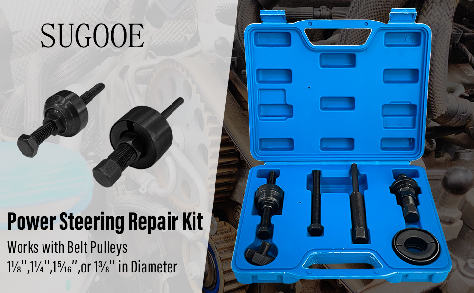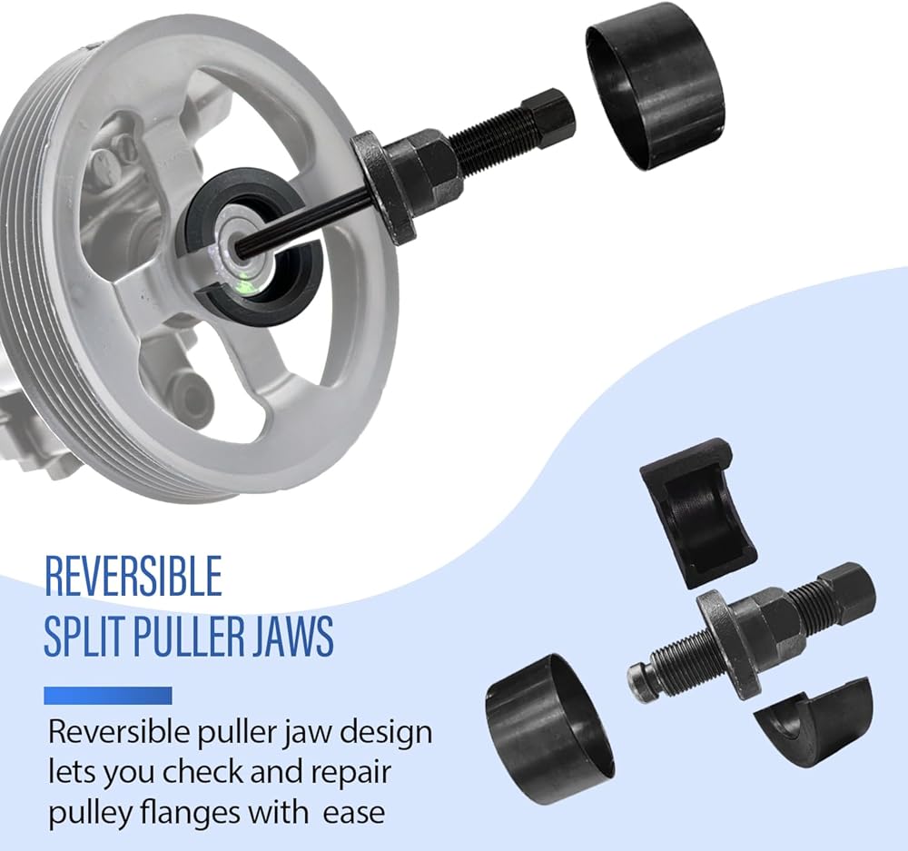 • مجموعة إصلاح التوجيه المعزز: تم تصميم أداة بكرة مضخة التوجيه المعززة لتثبيت وإزالة بكرات التوجيه المعزز بقطر المحور 1-1/8 بوصة، 1-1/4 بوصة، 1-5/16 بوصة، أو 1-3/8 بوصة.