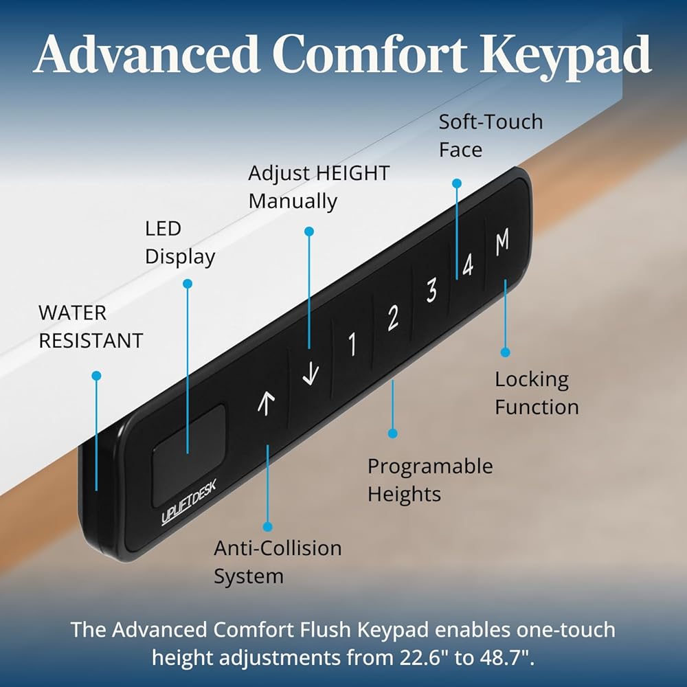 تعديل الارتفاع الكهربائي بسلاسة: تضمن لوحة المفاتيح المتقدمة المزودة بتحكم بلمسة واحدة وأربعة إعدادات مسبقة للذاكرة إجراء انتقالات سهلة. يتيح لك مكتب الوقوف القابل للتعديل هذا التبديل بين الجلوس والوقوف لتحسين الوضعية والدورة الدموية والإنتاجية.