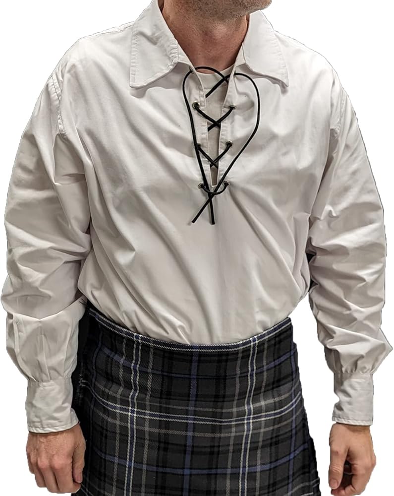 • تكريم تراثك الاسكتلندي: لقد كان قميص Ghillie أو Jacobite خيارًا كاجوال مفضلاً بين مرتدي التنورة في اسكتلندا لأجيال. يتكون من قميص فضفاض من القطن والبوليستر مع ياقة مفتوحة ومزودة بخيط جلدي. في حين أن هذا القميص الناعم مصنوع خصيصًا ليتناسب مع التنورة، فهو أيضًا مثالي لأزياء الهالوين أو العروض الدرامية أو الأزياء التنكرية.