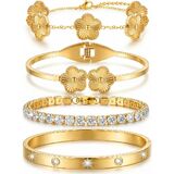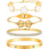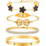 • 🍀SIZE: Clover bracelets set includes:Gold clover bracelet for women/Women's tennis bracelet stack: 17+5 CM. weight: 11.5 grams. Clover cuff bangle/Love bangles inner circumference: 18cm (7 inches), diameter: 2.36 inches x 1.97 inches, suitable for wrists 5.7 inches to 6.7 inches. Its smooth finish and secure clasp ensure all-day comfort and easy wearability.