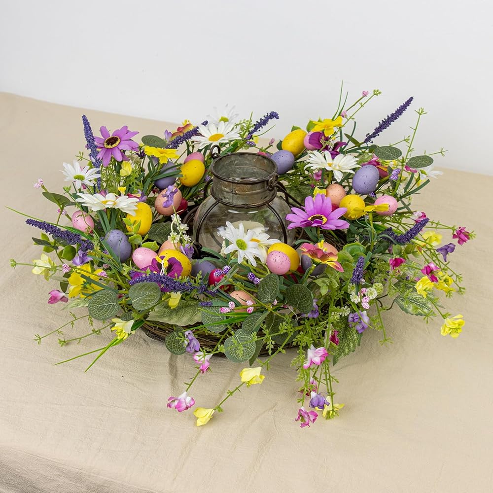 احتفالان في واحد: يتميز بقاعدة نابضة بالحياة من زهور الأقحوان الحريرية والأوركيد واللافندر والزهور البرية المزينة ببيض احتفالي، ويدمج إكليل عيد الفصح هذا ببراعة نضارة الربيع مع متعة عيد الفصح المرحة، مما يوفر قيمة زخرفية استثنائية.