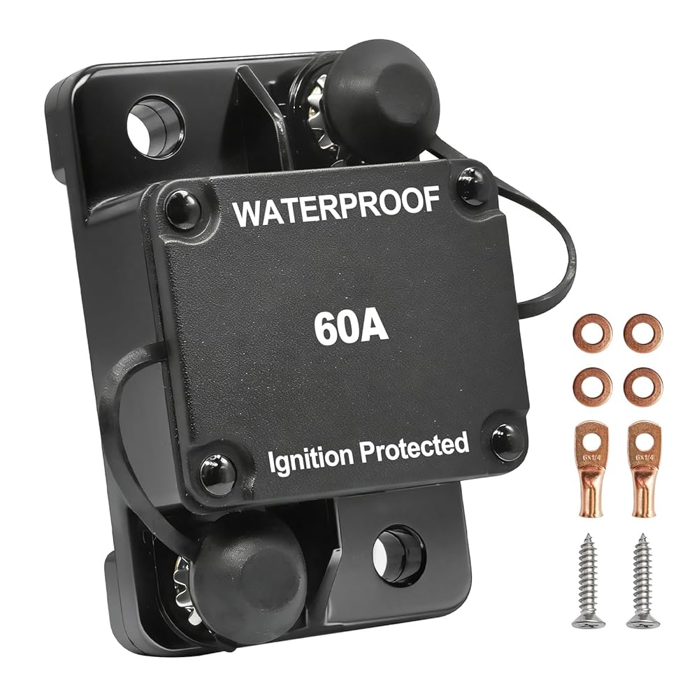 【All-in-One Packing List】 Comes with a complete installation kit to save you time and money. Package includes: 1x 60A Automatic Circuit Breaker, 2x 6AWG-1/4 Wire Lugs, 2x Self-Tapping Screws, 4x Copper Washers, and 4x Heat Shrink Tubes (various sizes). You don't need to run to the hardware store for extra parts; it's ready to install right out of the box.