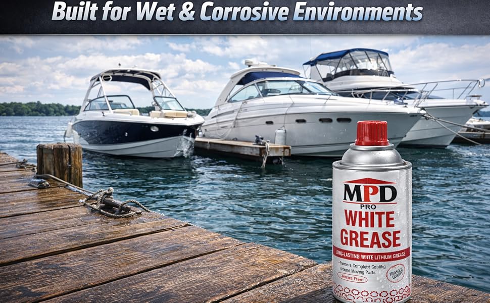 • أداء بحري، خالٍ من التنقيط - يبقى رذاذ شحم الليثيوم الأبيض عالي الصلابة في مكانه على الأسطح الرأسية والعلوية دون الجري، حتى في البيئات الرطبة أو المسببة للتآكل.