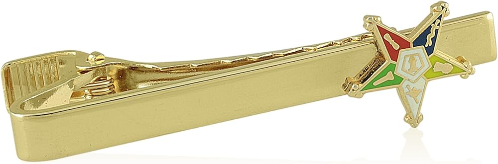 A beautiful gold toned tie pin, tie clip or tie bar adorned with the emblem of the Order of the Eastern Star. The tie pin/ tie bar / tie clip measures 2 inches and the featured OES emblem measures .75 inches x .75 inches. Perfect for any new or existing Patron and other male members of the Order of the Eastern Star. Makes a great gift for new members!