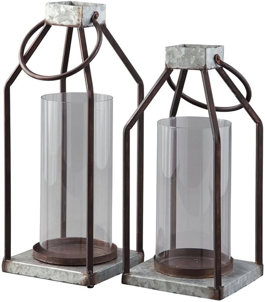 مجموعة حامل شموع فانوس من Bowery Hill مكونة من قطعتين، معدن وزجاج مجلفن، لمسة نهائية رمادية وسوداء، بطول 48.26 سم و43.18 سم، للاستخدام الداخلي/الخارجي، ظل إعصار مع مقابض للشموع الدعامة