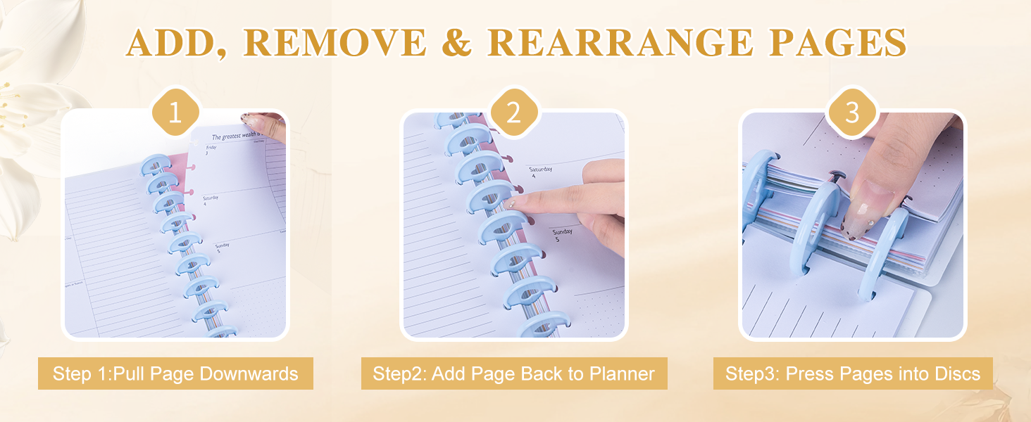 [ميزات ممتازة]: يحتوي كتاب تقويم 2026 على 9 فتحات للأقراص، وغطاء بلاستيكي مقاوم للماء، وجيب مزدوج الجوانب، و3 ملصقات، وورق مانع للنزيف 100 جرامًا للمتر المربع و12 فواصل ملونة للتنقل السريع. بالإضافة إلى ذلك، يسمح لك العمود الفقري المرن لمخطط القرص بإضافة الصفحات وإزالتها وإعادة ترتيبها بسهولة.