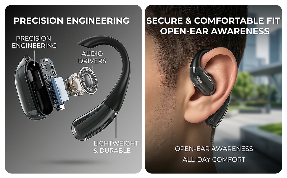【مصممة لراحة دائمة】 تتميز سماعات الأذن المفتوحة لدينا بتصميم مريح وخفيف الوزن للغاية مع خطافات سيليكون صديقة للبشرة. بوزن 7.5 جرام فقط لكل برعم، فإنها تستقر بشكل آمن وطبيعي خارج قناة أذنك لارتدائها طوال اليوم - مثالية للتنقل أو السفر أو الاجتماعات الطويلة. يبقيك تصميم الأذن المفتوحة على علم بما يحيط بك بأمان، بينما يحمي تصنيف IPX5 من العرق والمطر، مما يجعلها رفيقك المثالي لأي حياة يومية.