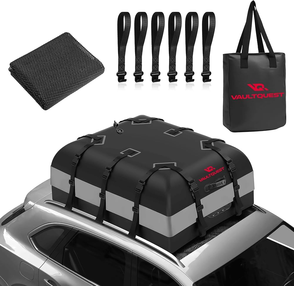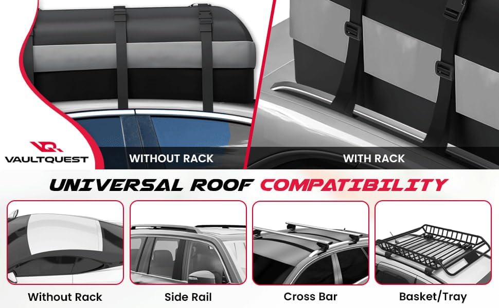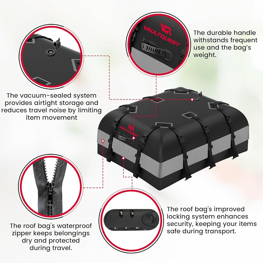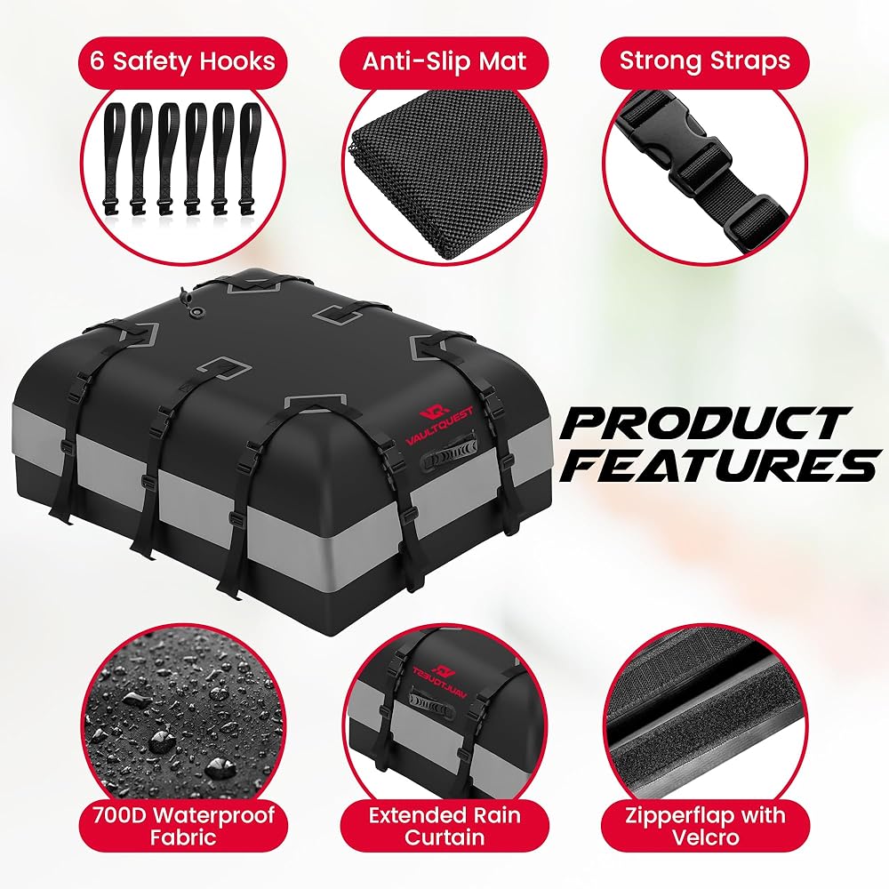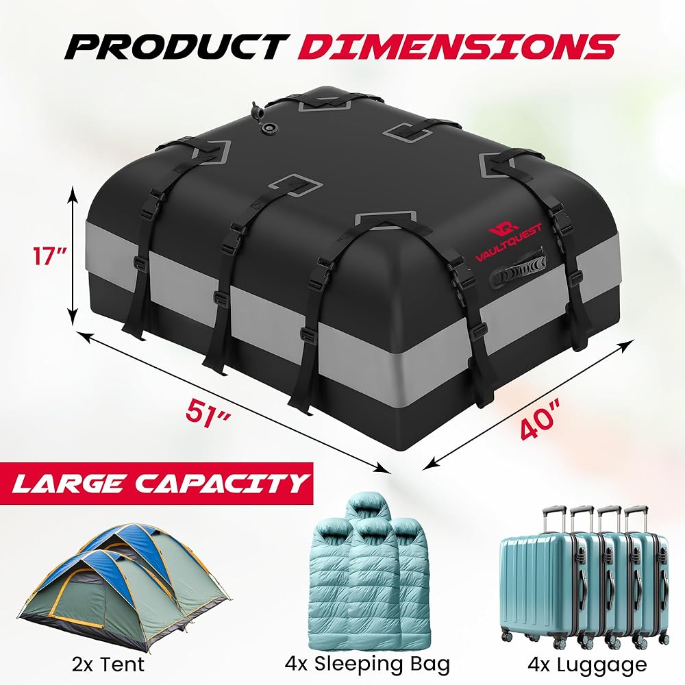 VaultQuest Roof Cargo Carrier System Experience the freedom of unlimited cargo space with our revolutionary roof bag system. This 51 by 40 by 17 inch carrier transforms any vehicle into a capable hauling machine. Whether you're planning a weekend camping trip or moving to a new home, this bag handles the toughest loads with ease. Weather Resistant Engineering Our 700D waterproof fabric creates an impenetrable barrier against nature's elements. The zipperflap with velcro closure adds extra protection beyond the waterproof zipper. From desert heat to mountain snow, your belongings remain pristine and protected throughout every journey. Secure Installation Made Simple The innovative dual mounting system accommodates all vehicle types. Use the included door hooks for cars without racks or attach directly to existing roof rails and cross bars. Strong straps with robust buckles ensure your cargo stays exactly where you place it, even during sudden turns or emergency stops. Revolutionary Vacuum Seal Technology The patented vacuum seal system eliminates air gaps and minimizes wind noise. This design reduces drag for better fuel economy while keeping contents compressed and stable. Internal padding prevents items from shifting during travel, protecting fragile belongings from damage. Complete Organization Solution Eight interior packing cubes help you organize gear by category or family member. The included travel bag stores everything when not in use. Anti-slip mat prevents movement on your roof while protecting the vehicle's finish from scratches. Professional Grade Materials Heavy duty straps withstand extreme tension without stretching or breaking. Military specification buckles lock with positive engagement you can hear and feel. Reinforced stress points at corners handle maximum loads without tearing or deformation.