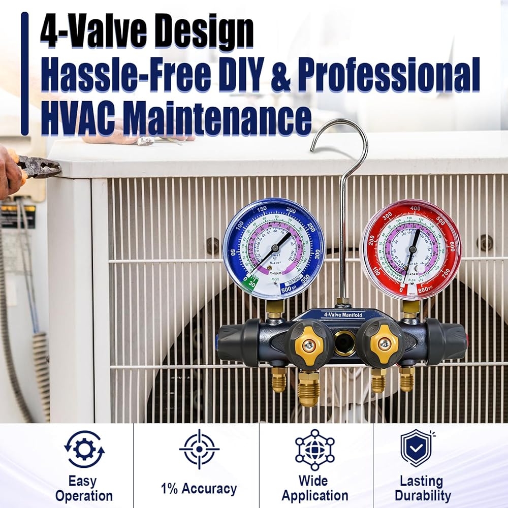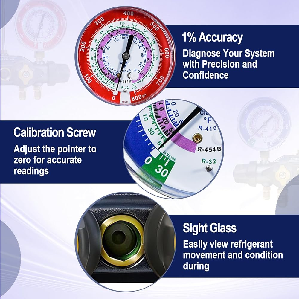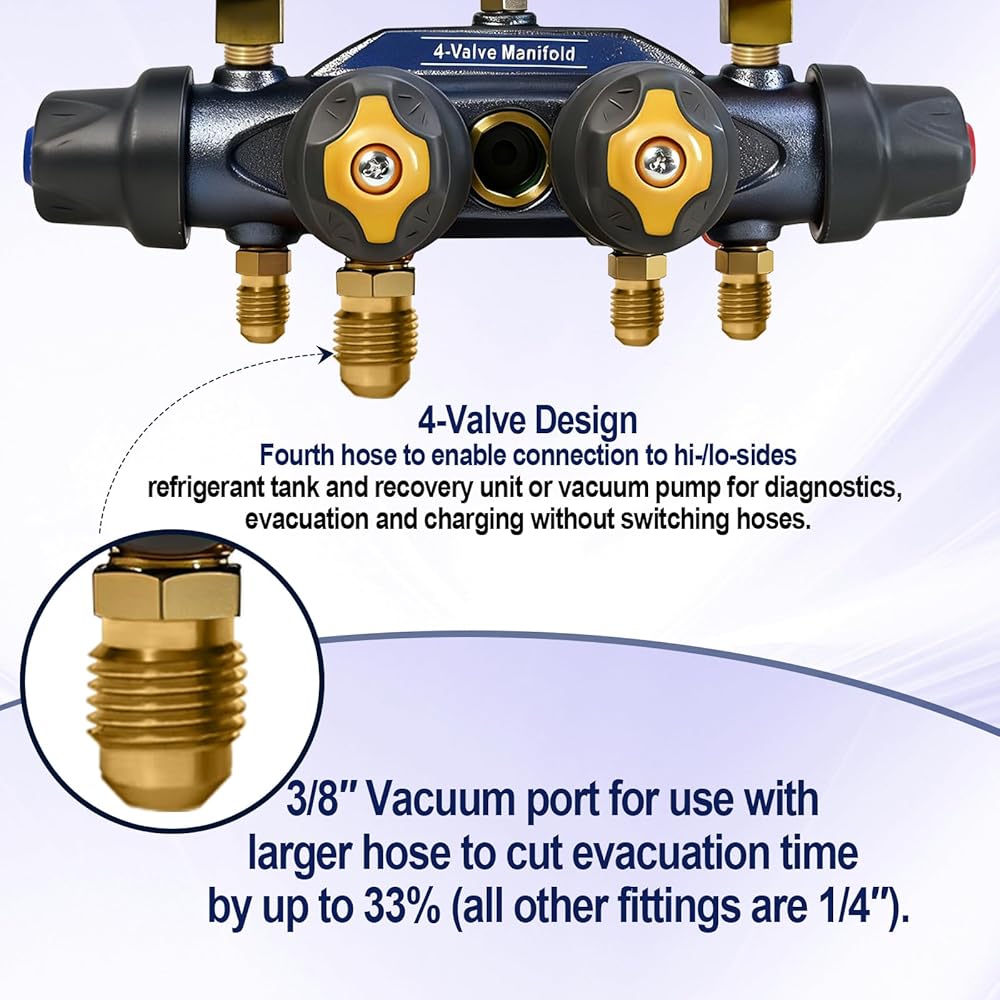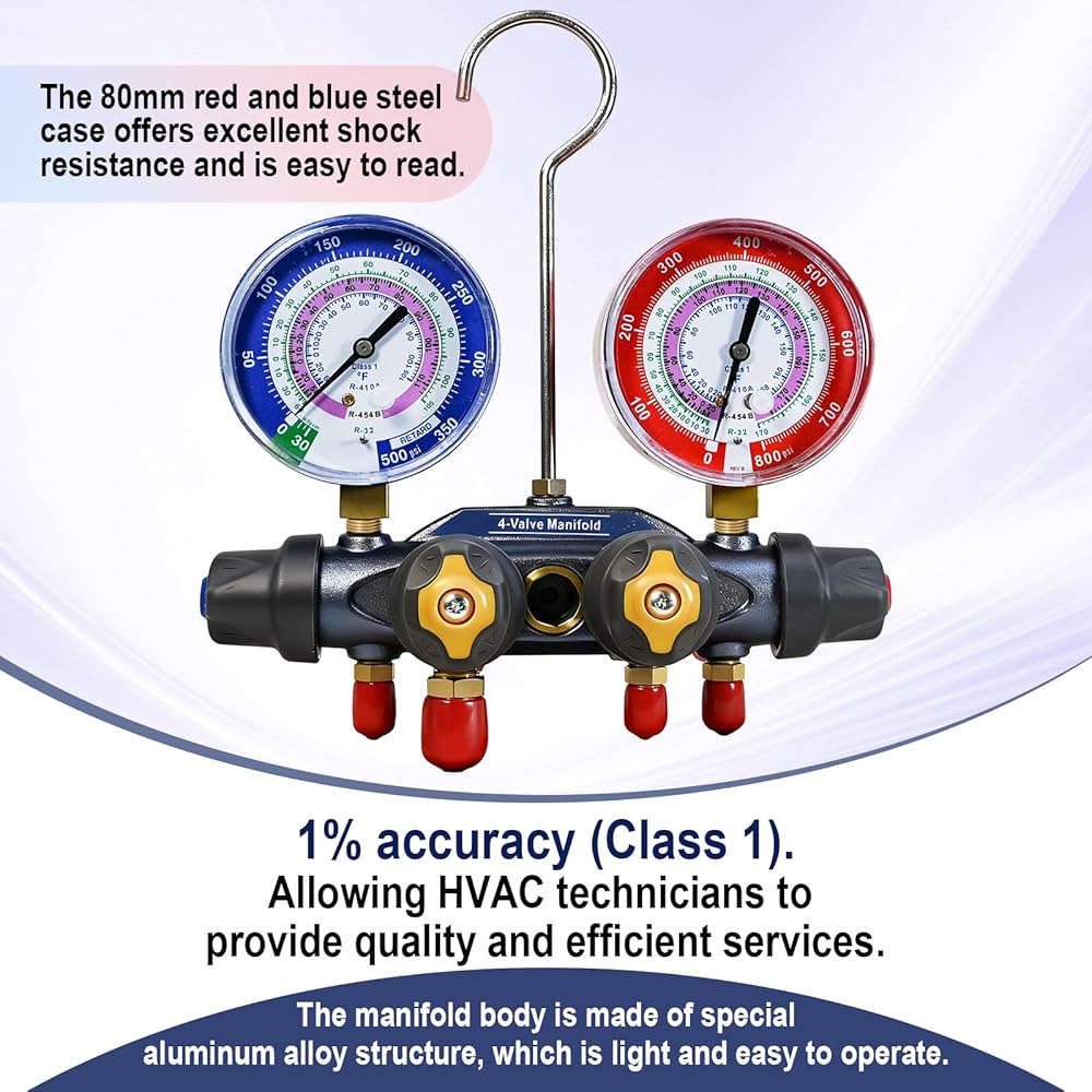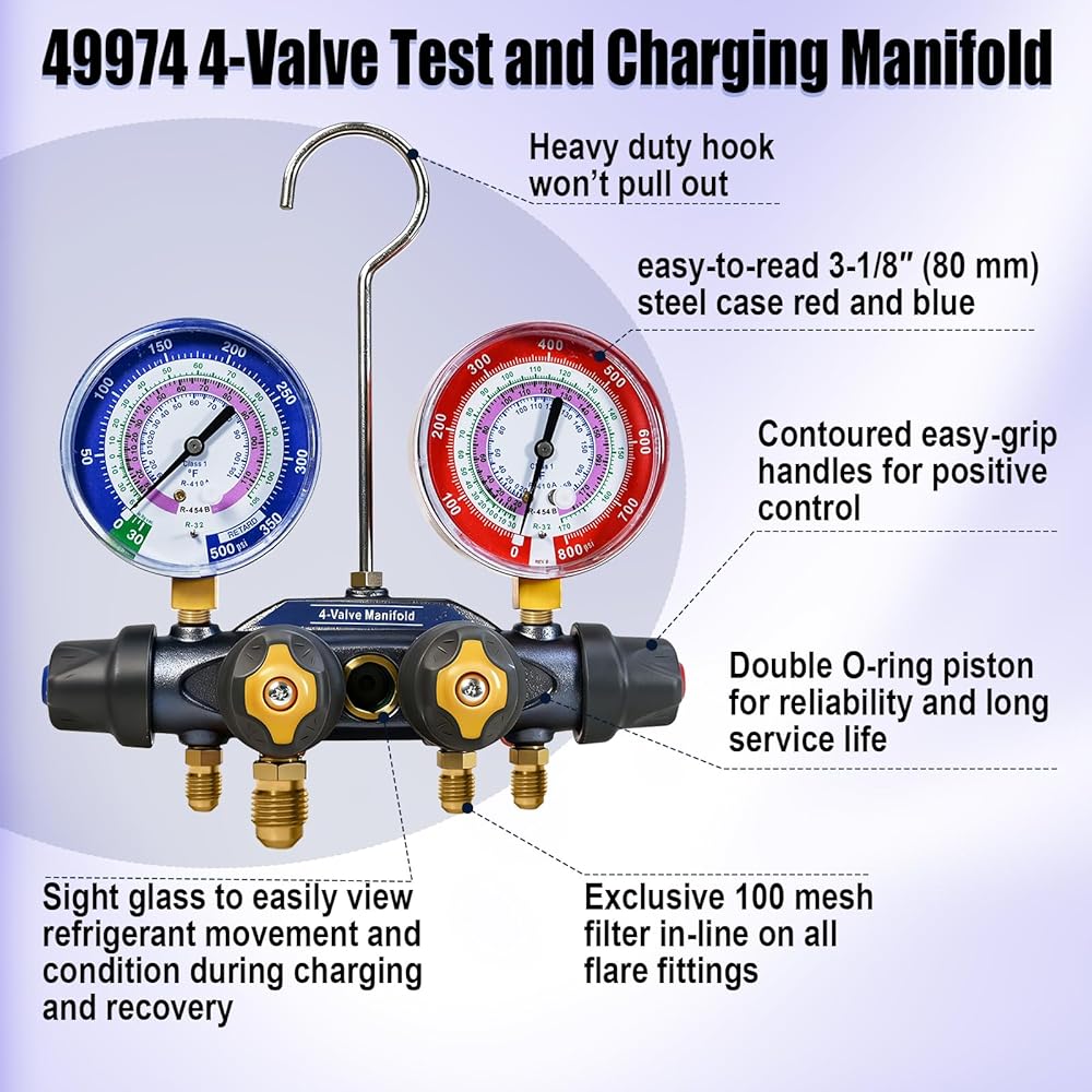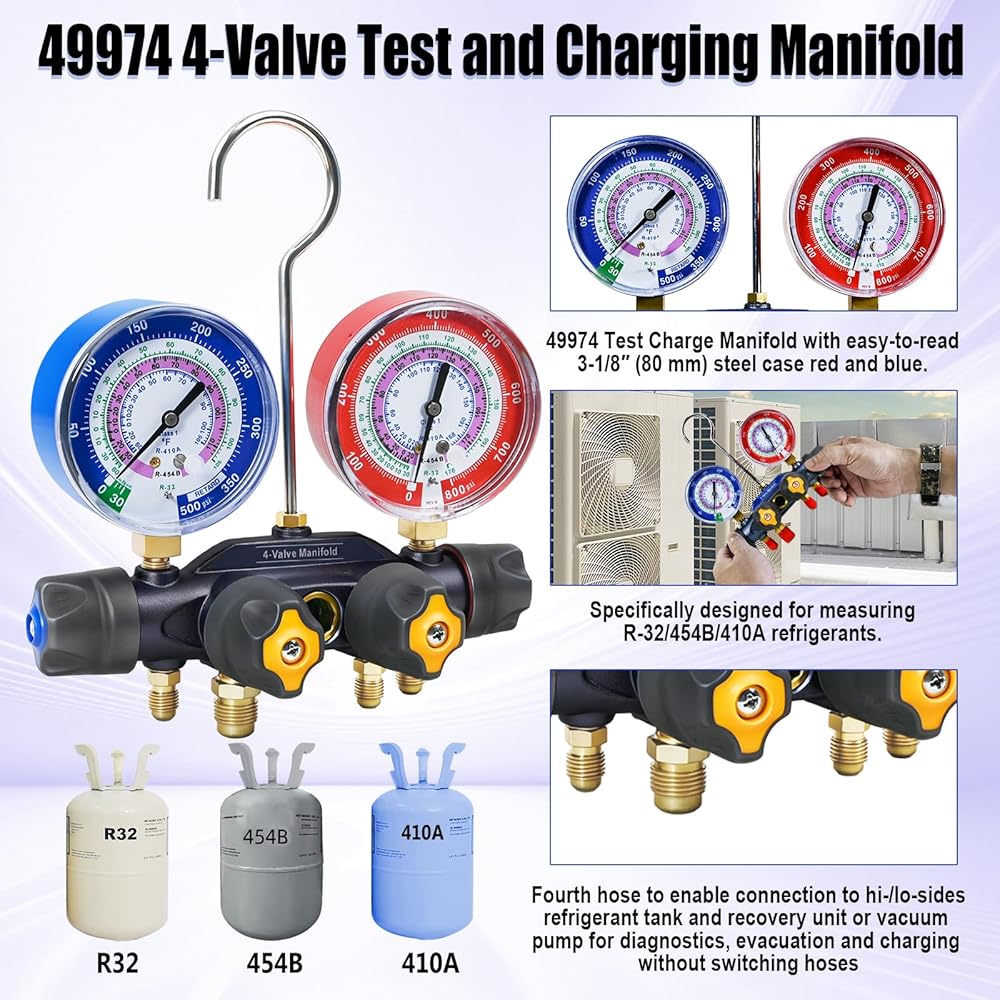 49974 4-Valve Test and Charging Manifold designed specifically for high-pressure, new environmentally friendly refrigerant systems R-32, R-454B, and R-410A, ensuring accurate and reliable readings.