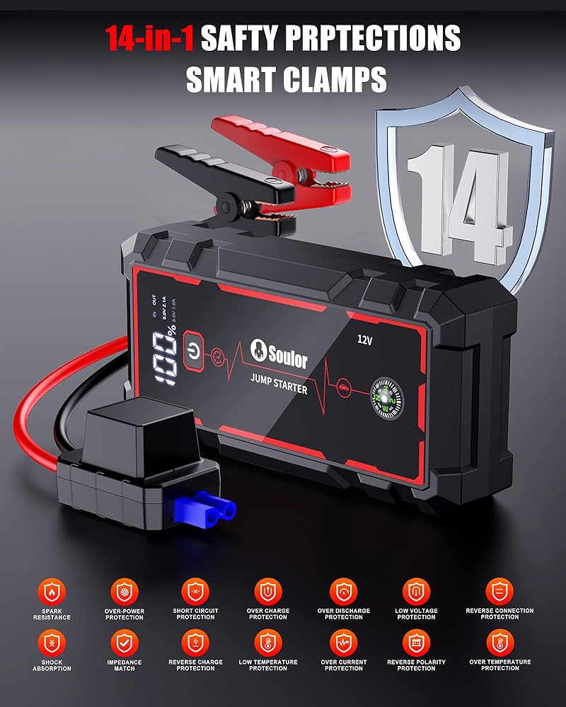 • 14-in-1 Safety Protections Smart Clamps:Our jump starter battery pack is designed with 14 comprehensive safety protection systems, including spark-proof, reverse polarity protection, over-current, short circuit, over-voltage, under-voltage, over-charge, over-discharge, high/low temperature protection and so on. No need to worry about incorrect connections or sparks—even beginners can use it safely and easily! The smart jump clamps with clear polarity marks make operation more simple and intuitive.
